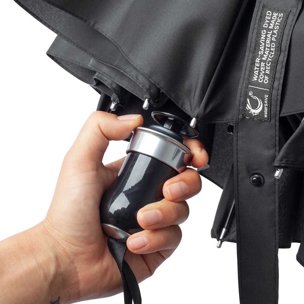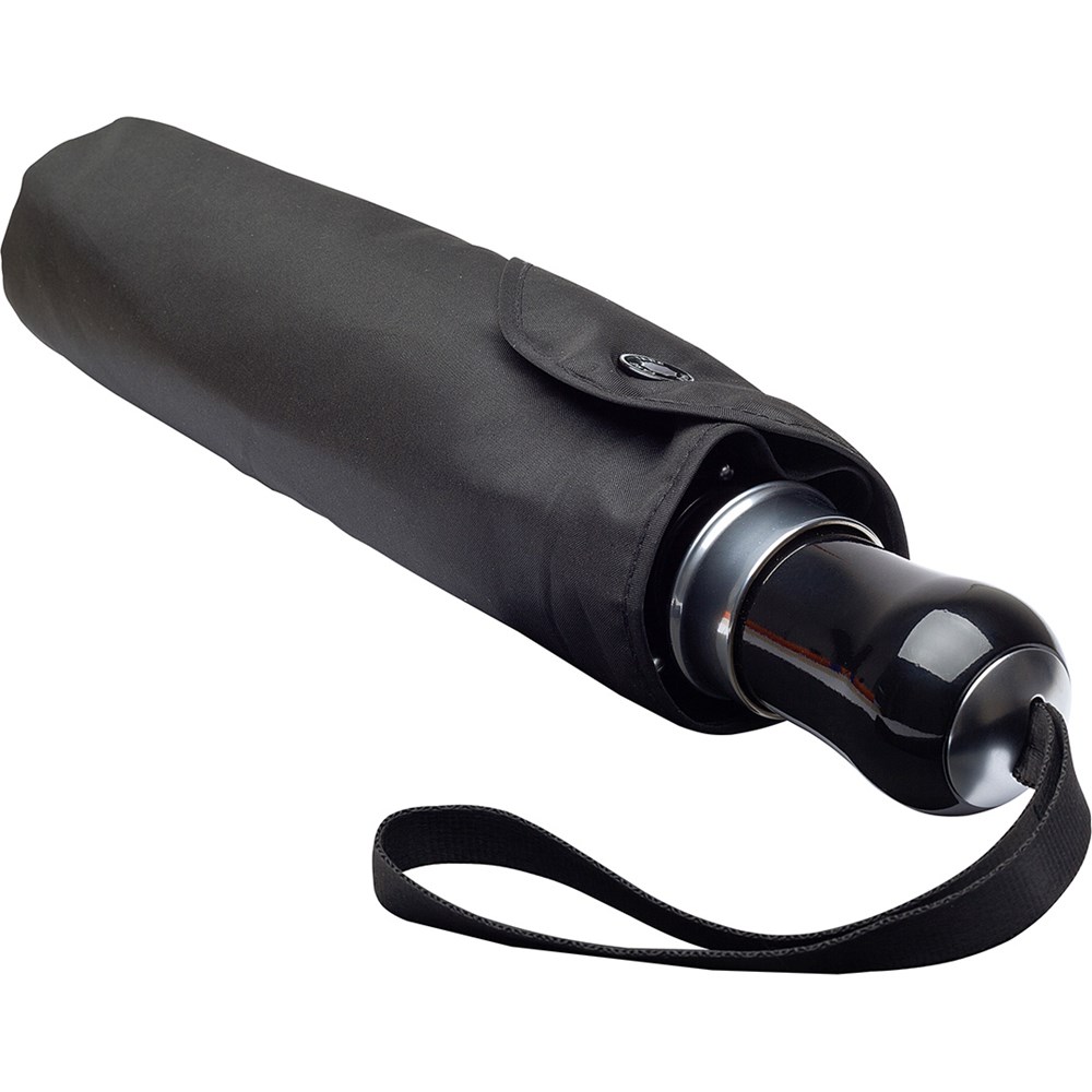 Schicker Taschenschirm mit neuartigem Öffnungs- und Schließmechanismus Komfortable Doppelautomatik-Funktion zum schnellen Öffnen und Schließen durch Herunterziehen des Rings, hochwertiges Windproof-PLUS-System für eine maximale Gestell-Flexibilität bei stärkeren Windböen, wassersparend gefärbtes Polyester-Pongee waterSAVE® Bezugsmaterial aus recycelten Kunststoffen, mit waterSAVE®-Label auf dem Schließband, silberne Nickelspitzen, Griff hochglänzend schwarz mit verchromten Applikationen und gewebter Trageschlaufe, Schließband und Futteral mit edlem Druckknopf