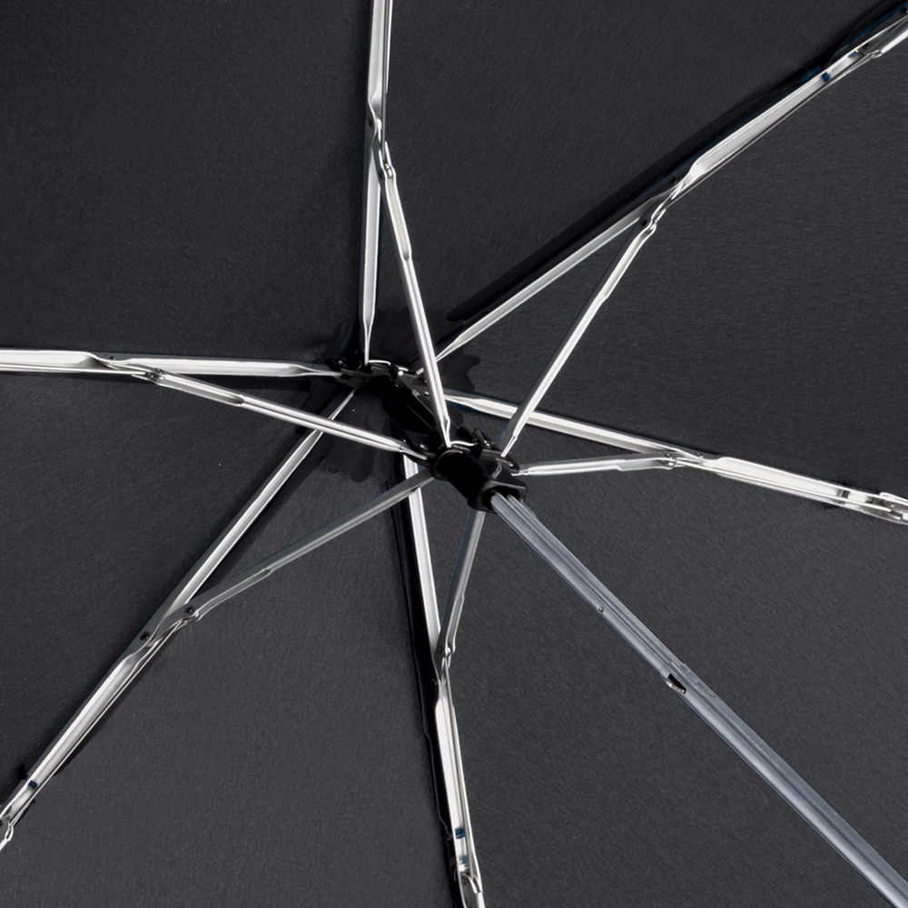 Ultraleichter Handöffner-Taschenschirm im praktischen Tragefutteral mit Karabinerhaken Hochwertiges Windproof-PLUS-System für eine maximale Gestell-Flexibilität bei stärkeren Windböen, verchromter Stahlstock, extra leichter Bezug, flacher Soft-Touch-Griff mit Werbeanbringungsmöglichkeit, Tragefutteral mit praktischem Karabinerhaken zur Befestigung an Rucksack oder Tasche, handtaschentauglich durch extrem leichtes Gewicht, platzsparend durch superflache Ausführung