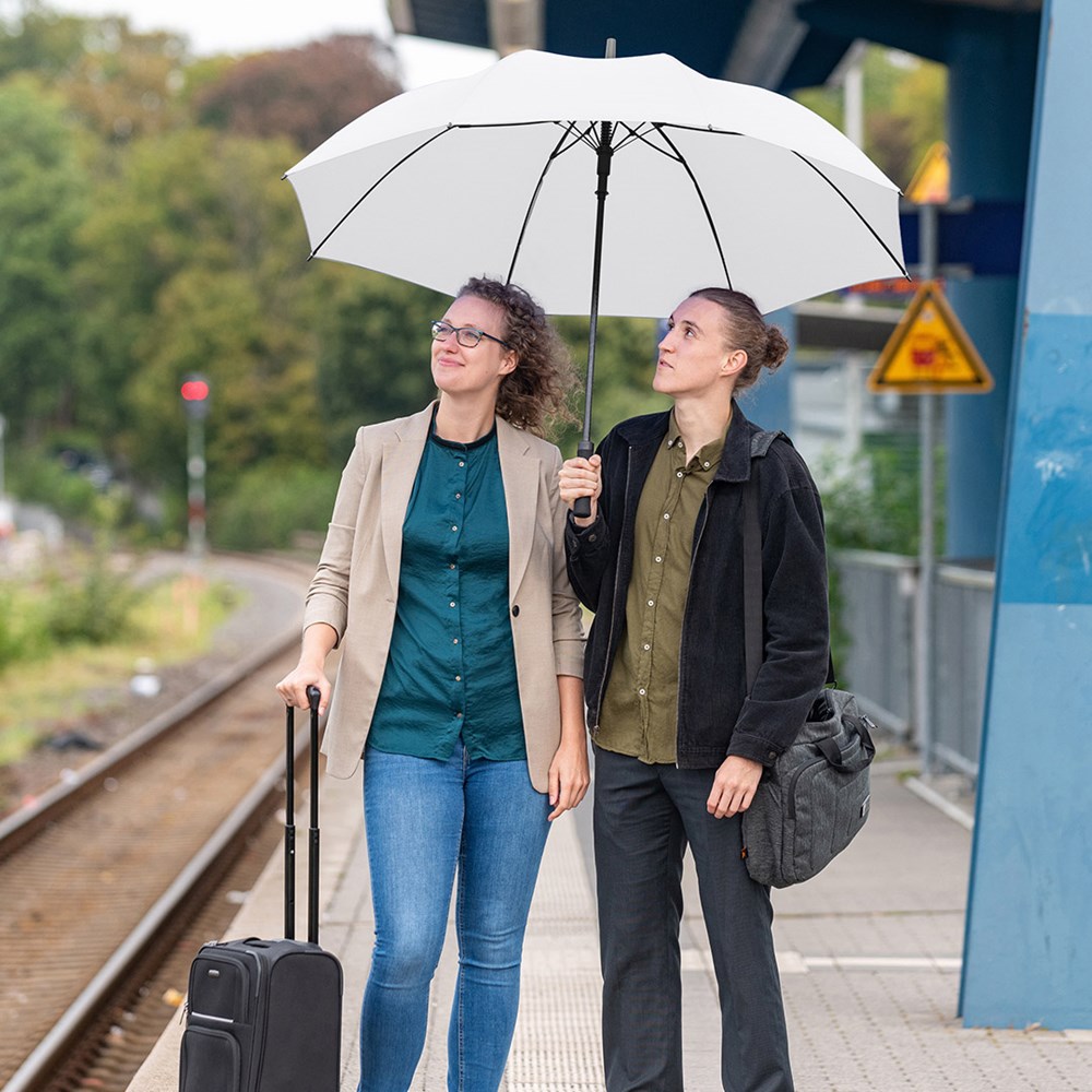 Äußerst stabiler Automatik-Gästeschirm für zwei Personen mit riesigem Durchmesser Komfortable Automatik-Funktion zum schnellen Öffnen, hochwertiges Windproof-PLUS-System für eine maximale Gestell-Flexibilität bei stärkeren Windböen, stabiler Fiberglasstock, flexible Fiberglasschienen, gerader Softgriff mit schmaler Auslösetaste, gastfreundlicher Durchmesser