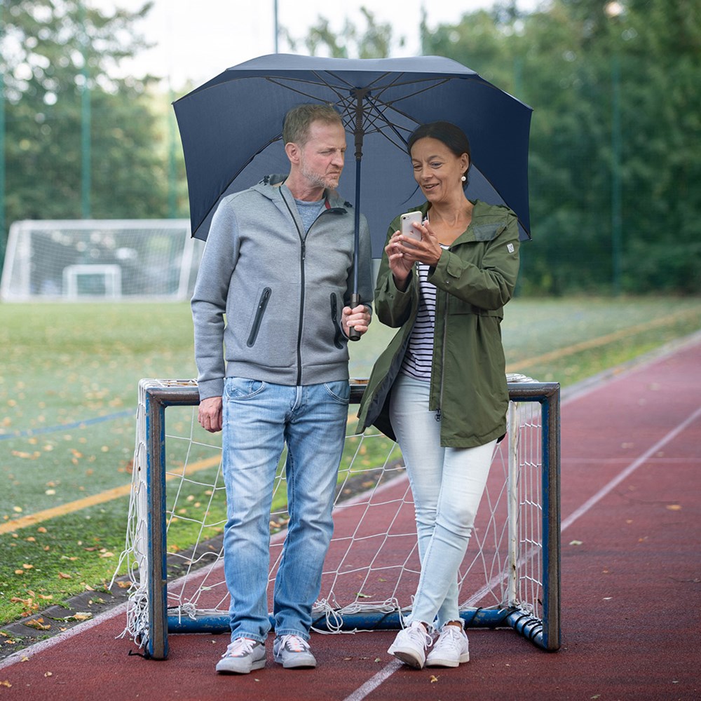 Quadratischer Gästeschirm für zwei Personen Komfortable Automatik-Funktion zum schnellen Öffnen, hochwertiges Windproof-PLUS-System für eine maximale Gestell-Flexibilität bei stärkeren Windböen, flexible Fiberglasschienen, farbige Ummantelung des Stahlstocks, gerader Soft-Touch-Griff mit integrierter Auslösetaste und doppelter Werbeanbringungsmöglichkeit, gastfreundlicher großer Durchmesser