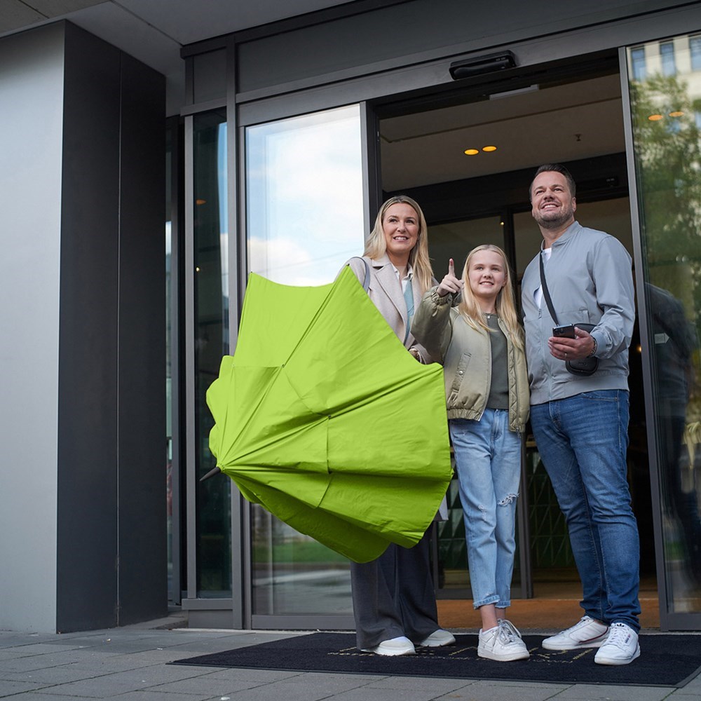 Exklusiver Automatik-Gästeschirm für zwei Personen mit Tropfenmotiv auf dem Fiberglasstock Komfortable Automatik-Funktion zum schnellen Öffnen, hochwertiges Windproof-PLUS-System für eine maximale Gestell-Flexibilität bei stärkeren Windböen, flexible Fiberglasschienen, stabiler Fiberglasstock mit Tropfenmotiv, wassersparend gefärbtes Polyester-Pongee waterSAVE® Bezugsmaterial aus recycelten Kunststoffen, mit waterSAVE® Label auf dem Schließband (bei neuen Chargen), von innen beschichteter Bezug, überlappender Ventilationsbezug zur Regulierung von Überdruck durch stärkere Windböen, gerader Softgriff mit farbigen Griffringen, integrierter Auslösetaste und Werbeanbringungsmöglichkeit, Tropfenmotiv und Griffringe farblich auf den Bezug abgestimmt