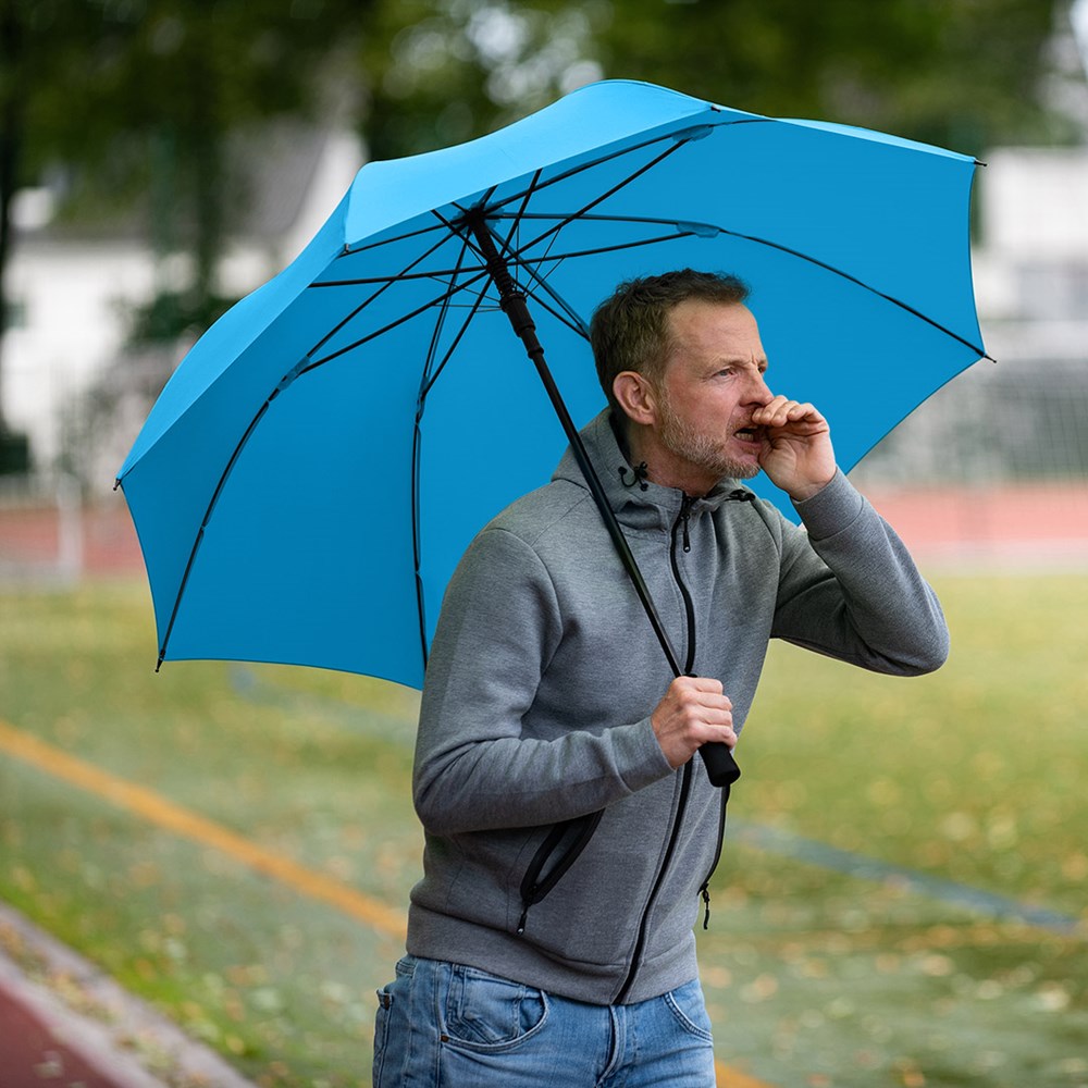 Komfortabler Automatik-Gästeschirm für zwei Personen mit handsympathischem Softgriff Komfortable Automatik-Funktion zum schnellen Öffnen, höhere Gestell-Flexibilität und bessere Windsicherheit durch Windproof-System, flexible Fiberglasschienen, gerader Softgriff, höherer Korrosionsschutz durch schwarze Galvanisierung des Stahlstocks, gastfreundlicher großer Durchmesser