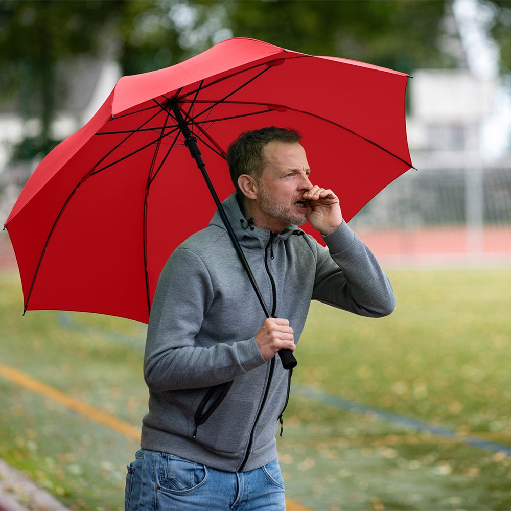 Komfortabler Automatik-Gästeschirm für zwei Personen mit handsympathischem Softgriff Komfortable Automatik-Funktion zum schnellen Öffnen, höhere Gestell-Flexibilität und bessere Windsicherheit durch Windproof-System, flexible Fiberglasschienen, gerader Softgriff, höherer Korrosionsschutz durch schwarze Galvanisierung des Stahlstocks, gastfreundlicher großer Durchmesser