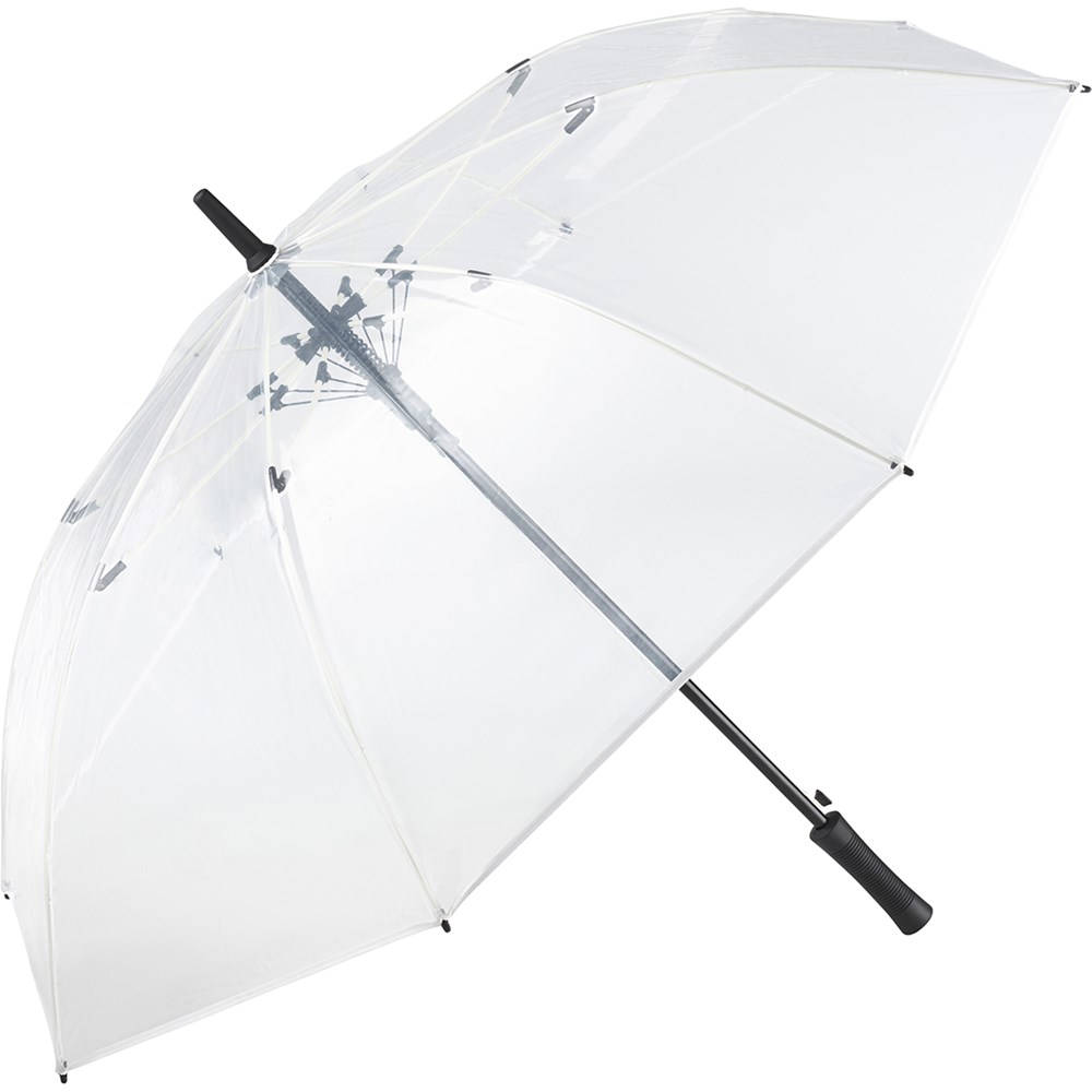 Ansprechender Automatik-Gästeschirm für zwei Personen mit transparentem Bezug und farbigen Details Komfortable Automatik-Funktion zum schnellen Öffnen, hochwertiges Windproof-PLUS-System für eine maximale Gestell-Flexibilität bei stärkeren Windböen, flexible Fiberglasschienen, farblich aufeinander abgestimmte Design-Elemente, matt-schwarzer gerader Kunststoffgriff mit Werbeanbringungsmöglichkeit, höherer Korrosionsschutz durch schwarze Galvanisierung des Stahlstocks