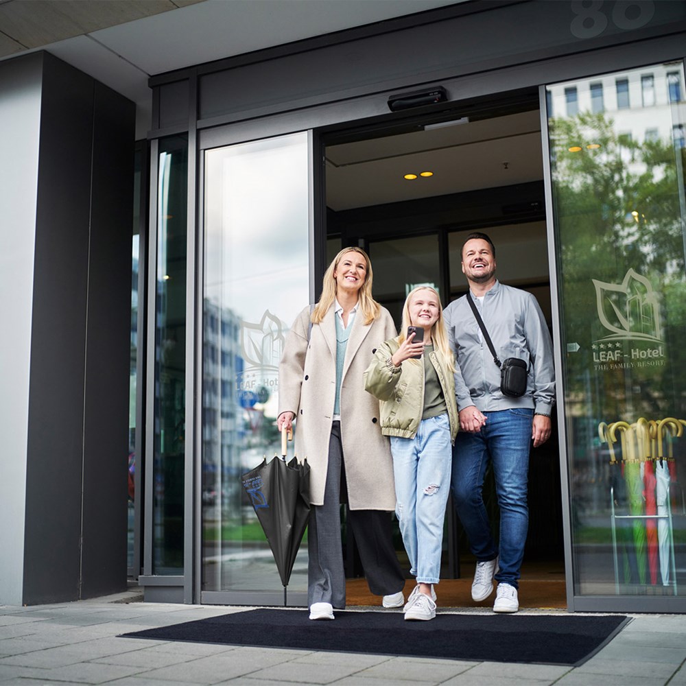Preislich attraktiver nachhaltiger Gästeschirm mit Bezug aus recycelten Kunststoffen und Echtholzelementen Komfortable Automatik-Funktion zum schnellen Öffnen, Windproof-System für höhere Gestell-Flexibilität und bessere Windsicherheit, flexible Fiberglasschienen, wassersparend gefärbtes Polyester-Pongee waterSAVE® Bezugsmaterial aus recycelten Kunststoffen, mit waterSAVE® Label auf dem Schließband, Echtholzspitzen, Rundhakengriff aus Echtholz, höherer Korrosionsschutz durch schwarze Galvanisierung des Stahlstocks
