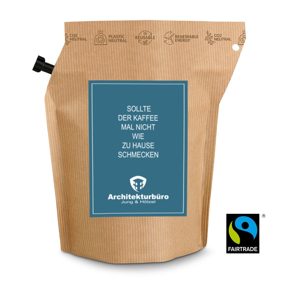 Werben Sie mit dem Geschmack von frisch gemahlenen Fairtrade Kaffeebohnen aus dem Honduras und verschenken Sie eine Wohltat für Körper und Seele. Der Brewer ist ideal für den geschäftigen Alltag, das Büro, auf Reisen, beim Camping, für Musikfestivals oder zu Hause. Er verbindet Komfort in der Zubereitung mit feinstem Geschmack: Der mehrfach wiederverwendbare Beutel ist gefüllt mit frisch gemahlenen Fairtrade Kaffeebohnen. Ein integrierter Filter ermöglicht die schnelle und unkomplizierte Zubereitung. Einfach heißes Wasser aufgießen, ziehen lassen, ausschenken und genießen! Kein „Instant-Produkt”! Ab 100 Stück mit Frontetikett im Eigendesign. Ergibt ca. 300 ml je nach gewünschter Stärke. Herstellung 100% CO2 neutral (WeForest validiertes Baumpflanzungs-Projekt + UN kontrolliertes REED Kohlenstoffkompensationsprojekt) und Plastik neutral (Plastic Bank® zertifizierter Ausgleich durch das Sammeln von im Meer befindlichem Plastik) und mit Windenergie.