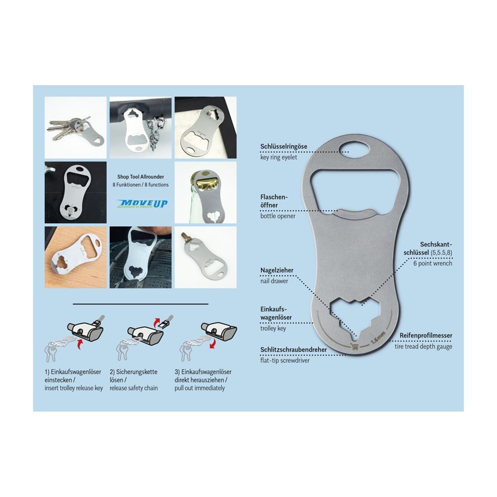Die praktischen ROMINOX© Multitools gibt es jetzt auch als schlanke Einkaufswagenlöser für den Schlüsselbund! Klein, leicht und doch vielseitig überzeugen die neuen Shop Tools im Alltag. Robuster Werkzeugstahl, inkl. Funktionsbeschreibung und Standard-Kartonverpackung, kundenindividuelle Verpackung ab 100 Stück möglich (Werkzeugstahl). Shop Tool als Schlüsselanhänger mit 8 Funktionen: 1 Einkaufswagenlöser, 1 Flaschenöffner, 1 Schlitzschraubendreher, 1 Reifenprofilmesser (1,6 mm), 1 Nagelzieher, 3 Sechskantschlüssel - ab 3‘000 Stück auch als Sonderproduktion mit individueller Form möglich. Sprechen Sie uns an!