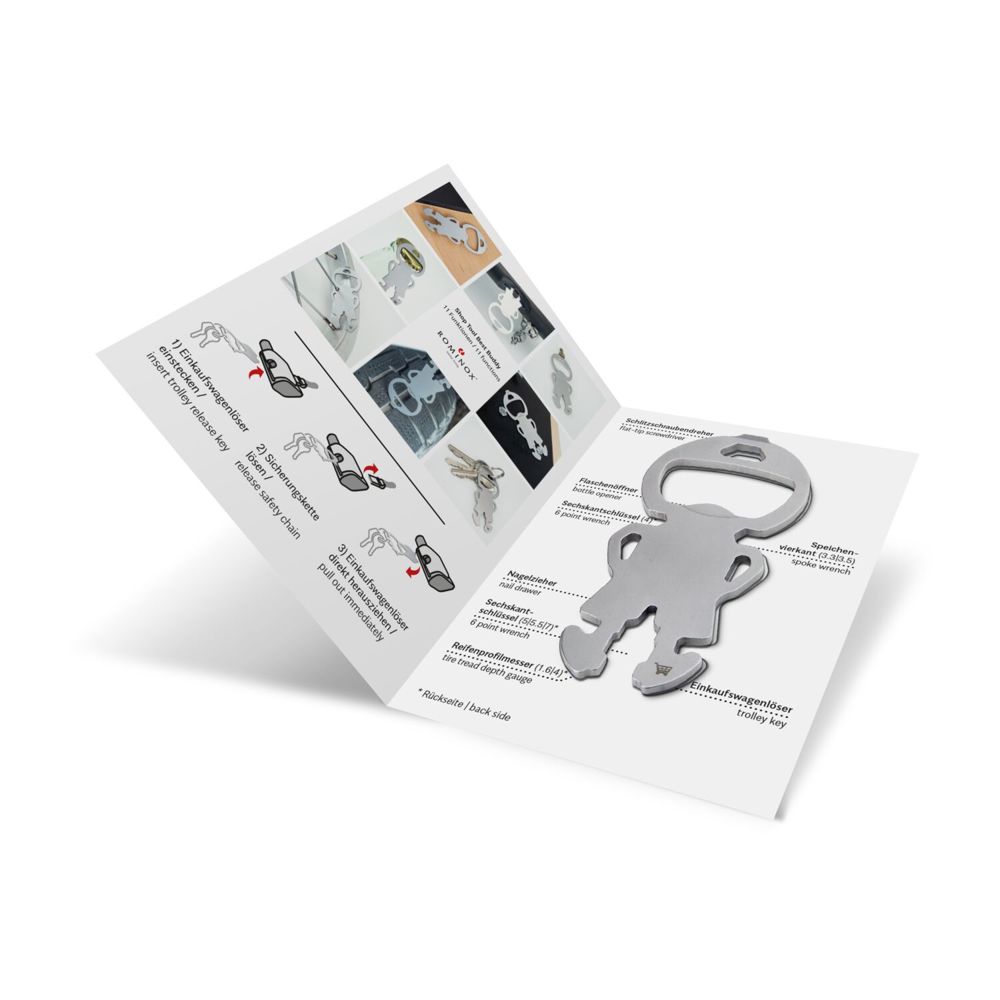 Die praktischen ROMINOX© Multitools gibt es jetzt auch als schlanke Einkaufswagenlöser für den Schlüsselbund! Klein, leicht und doch vielseitig überzeugen die neuen Shop Tools im Alltag. Robuster Werkzeugstahl, inkl. Funktionsbeschreibung und Standard-Kartonverpackung, kundenindividuelle Verpackung ab 100 Stück möglich (Werkzeugstahl). Shop Tool als Schlüsselanhänger mit 12 Funktionen: 1 Einkaufswagenlöser, 1 Flaschenöffner, 1 Schlitzschraubendreher, 2 Reifenprofilmesser (1,6 mm und 4 mm), 1 Nagelzieher, 2 Speichenvierkant, 4 Sechskantschlüssel - ab 3‘000 Stück auch als Sonderproduktion mit individueller Form möglich. Sprechen Sie uns an!