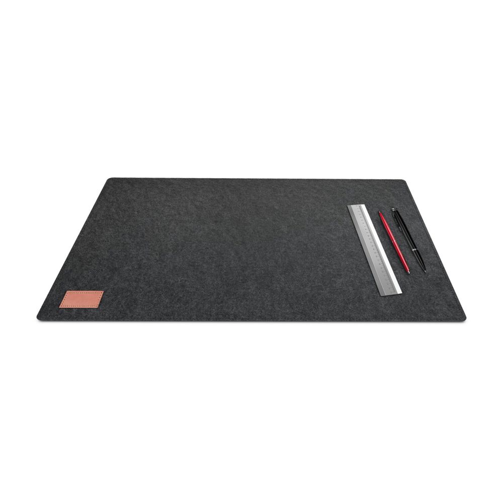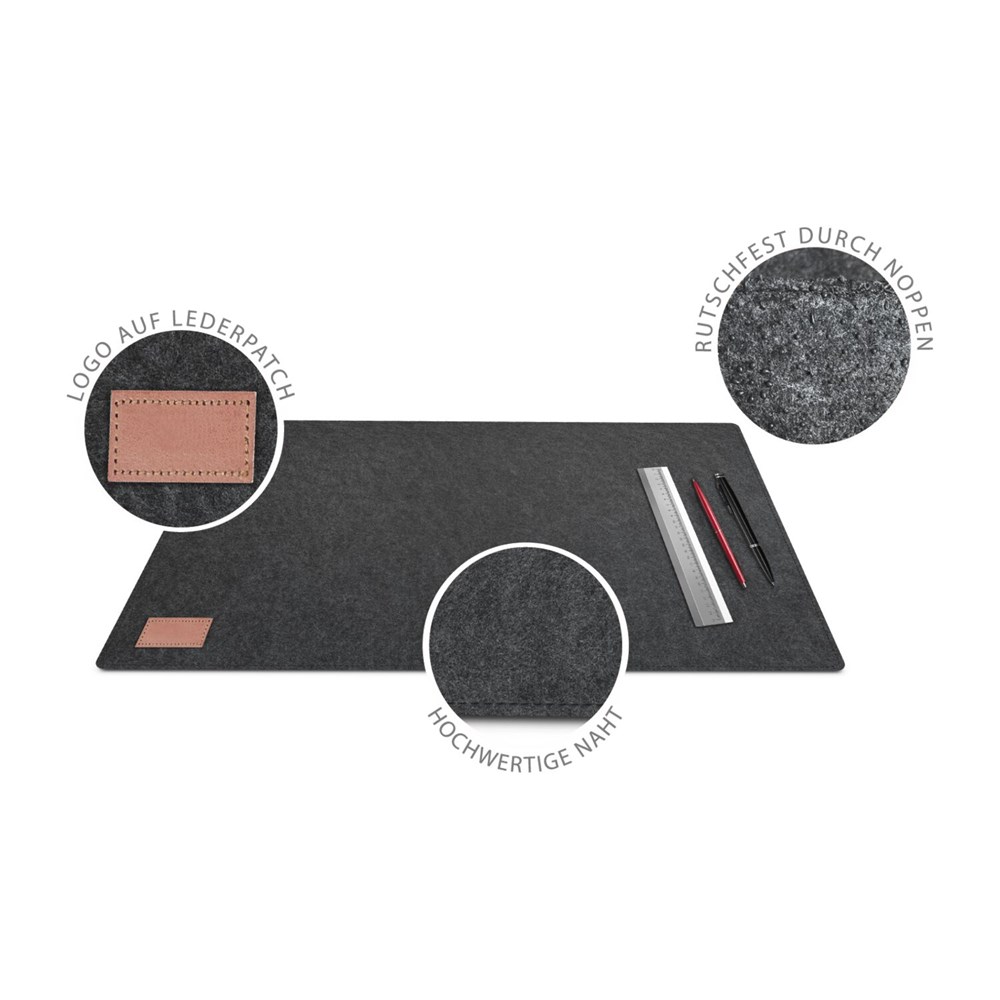 Hochwertige Schreibtischunterlage aus Filz, modernes, dunkles Anthrazit passend zu jedem Schreibtisch, praktische Antirutschunterseite, hochwertiger Saum, edles, aufgenähtes Badge in Lederoptik (veganer Filz aus 100 % recyceltem PET, zertifiziert nach Global Recycling Standard, Kunstleder)