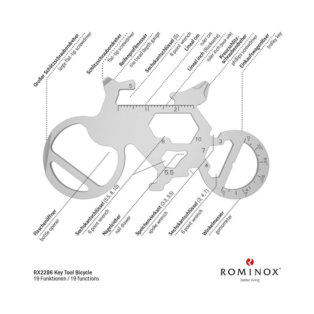 Multitool (aus robustem Edelstahl) für den Schlüsselbund inkl. Funktionsbeschreibung und Standard-Kartonverpackung, kundenindividuelle Verpackung und Funktionsbeschreibung ab 100 Stück möglich. In verschiedenen Designs verfügbar. Key Tool als Schlüsselanhänger mit 19 Funktionen: 7 Sechskantschlüssel, 2 Speichenvierkant, 1 Winkelmesser, 1 Einkaufswagenlöser, 2 Schlitzschraubendreher, 1 Nagelzieher, 1 Kreuzschlitzschraubendreher, 1 Flaschenöffner, 1 Zentimeter Lineal, 1 Inch Lineal, 1 Reifenprofilmesser (1,6 mm) - ab 3.000 Stück auch als Sonderproduktion mit individueller Key Tool Form möglich. Sprechen Sie uns an!