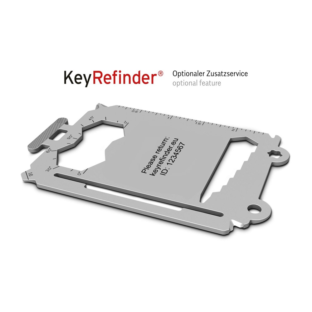 Praktischer Reisebegleiter im Kreditkartenformat: Reisegepäckanhänger mit 30 (Werkzeug-)Funktionen, inkl. hochwertigem Etui zum Schutz der Adressdaten, inkl. gummiertem Stahlband, große Veredelungsfläche für Doming oder Gravur, flexible Beschriftung durch mitgelieferte Aufkleber, kundenindividuelle Verpackung und Funktionsbeschreibung ab 100 Stück möglich. (Werkzeugstahl, PU). Kofferanhänger mit 30 Funktionen: 11 Sechskantschlüssel, 2 Speichenvierkant, 3 Schlitzschraubendreher, 1 Nagelzieher, 1 Kreuzschlitzschraubendreher, 1 Kabelzieher, 1 Flaschenöffner, 1 Zentimeter Lineal, 1 Inch Lineal, 1 Reifenprofilmesser (1,6 mm), 1 Nagelfeile, 1 Flügelmutterschlüssel, 1 Ringöse, 1 Paketöffner, 1 Winkelmesser, 1 Handyhalter, 1 Adressfeld - ab 3.000 Stück auch als Sonderproduktion mit individueller Key Tool Form möglich. Sprechen Sie uns an!