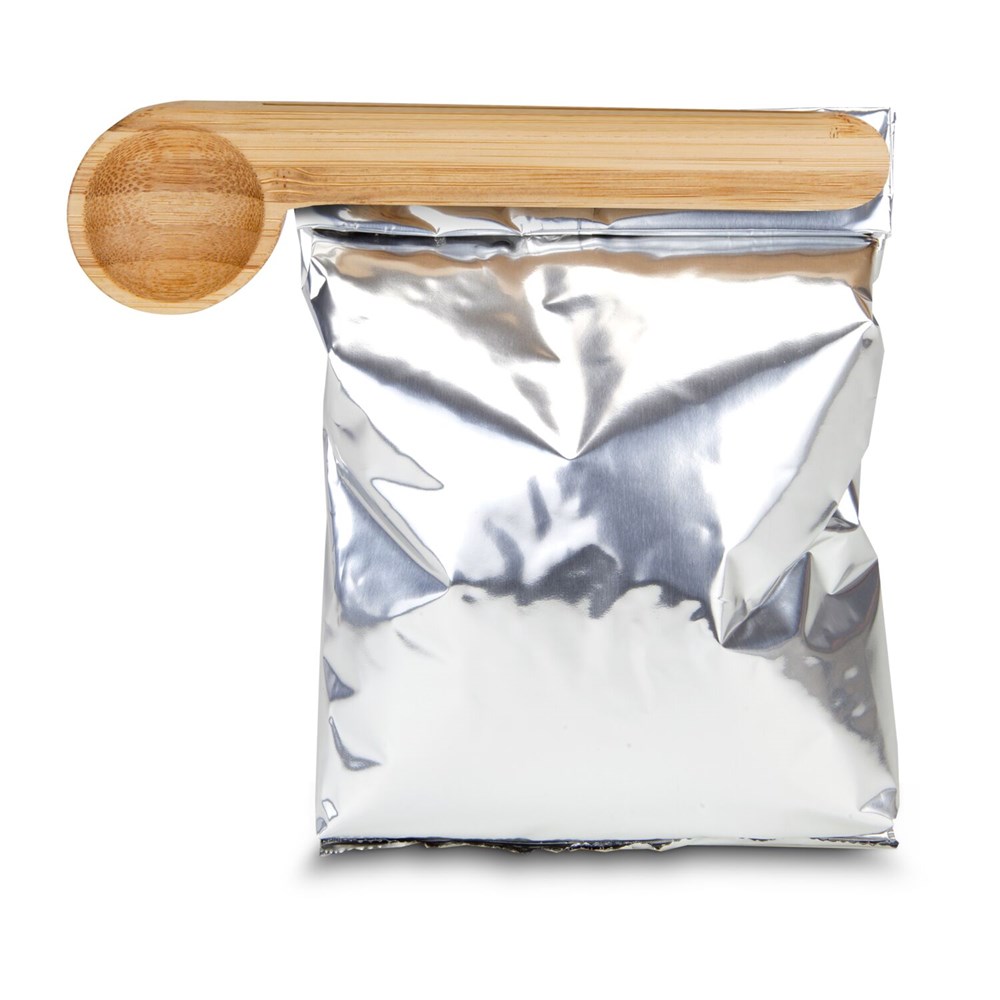 Pfiffiger Bambus-Messlöffel mit zwei Funktionen, dient zum Abmessen von einem Esslöffel (1 EL) Kaffee, Tee oder anderem Pulver, kann zudem als praktischer Verschluss für angebrochene Verpackungen genutzt werden: offenes Ende falten, Löffel-Clip darüber schieben und Inhalt länger frisch halten (Bambus)