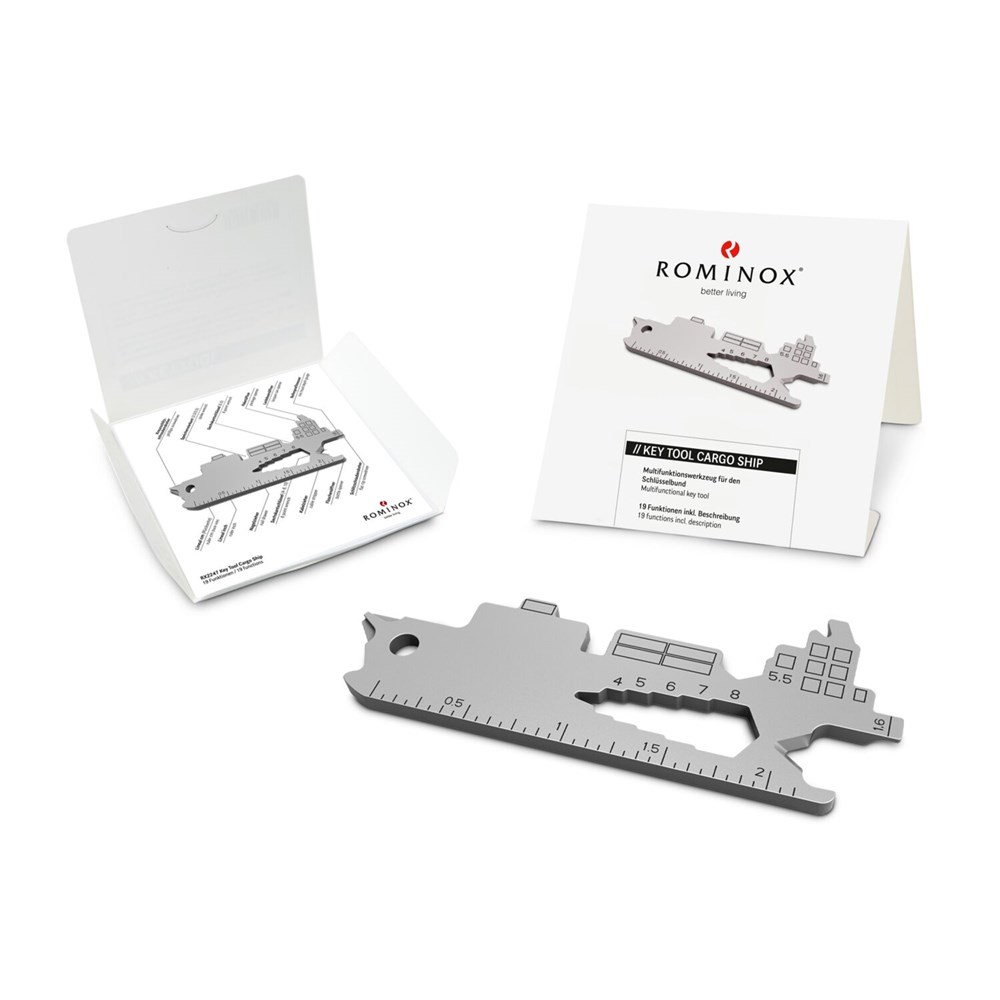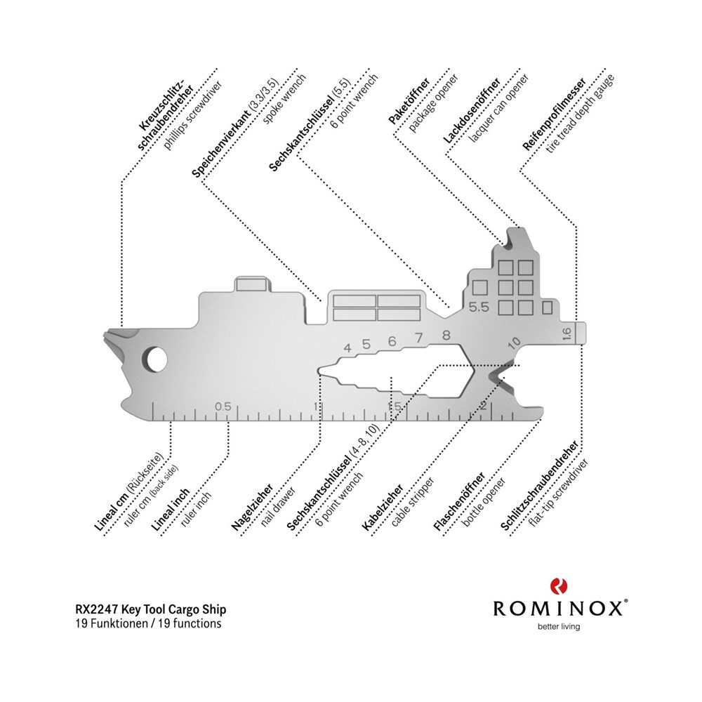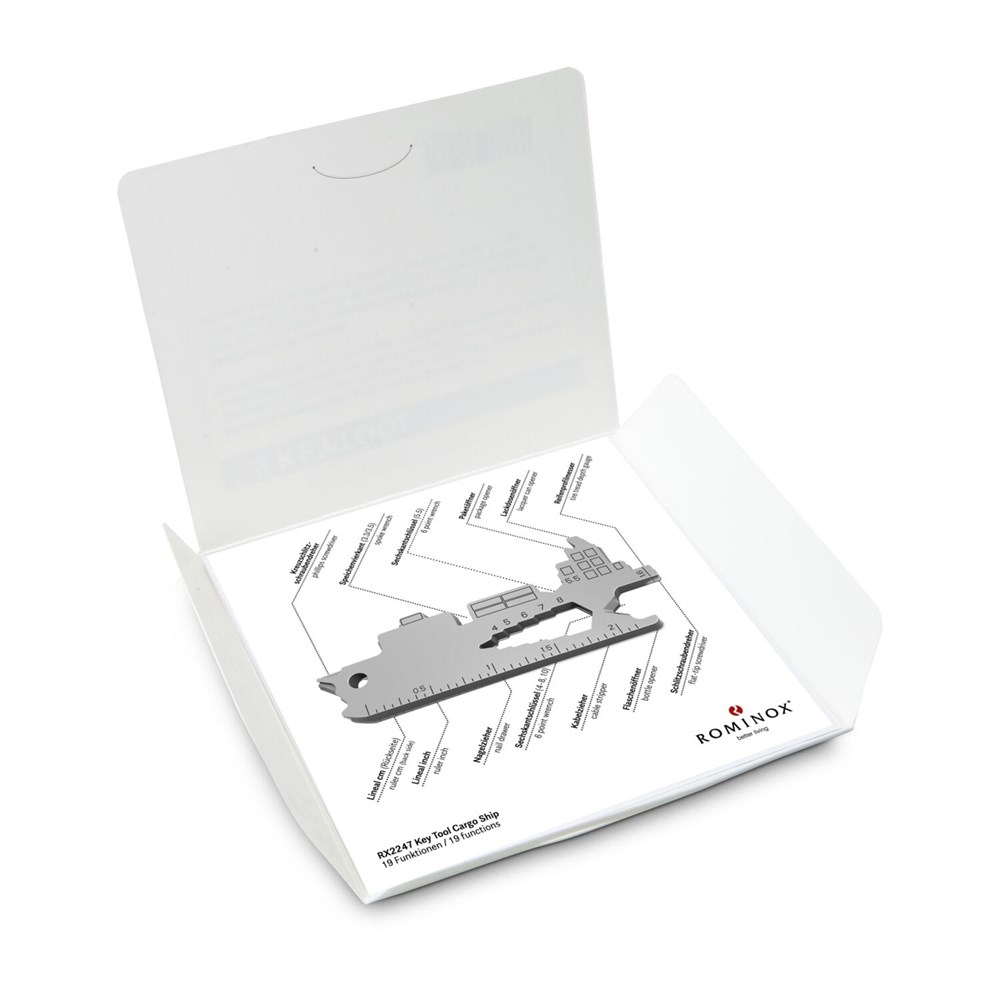Multitool (aus robustem Edelstahl) für den Schlüsselbund inkl. Funktionsbeschreibung und Standard-Kartonverpackung, kundenindividuelle Verpackung und Funktionsbeschreibung ab 100 Stück möglich. In verschiedenen Standarddesigns verfügbar. Key Tool als Schlüsselanhänger mit 19 Funktionen: 7 Sechskantschlüssel, 2 Speichenvierkant, 1 Schlitzschraubendreher, 1 Nagelzieher, 1 Kreuzschlitzschraubendreher, 1 Kabelzieher, 1 Flaschenöffner, 1 Zentimeter Lineal, 1 Inch Lineal, 1 Reifenprofilmesser (1,6 mm), 1 Lackdosenöffner, 1 Paketöffner - ab 3.000 Stück auch als Sonderproduktion mit individueller Key Tool Form möglich. Sprechen Sie uns an!
