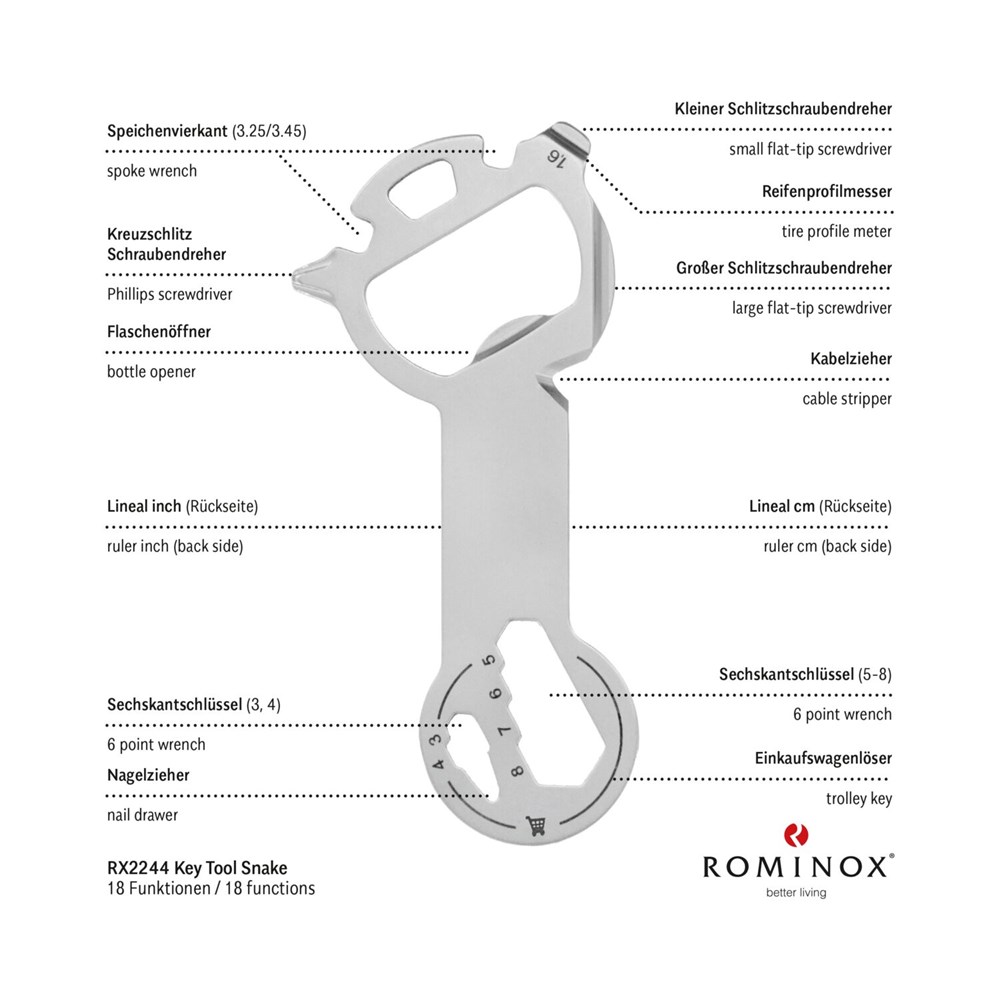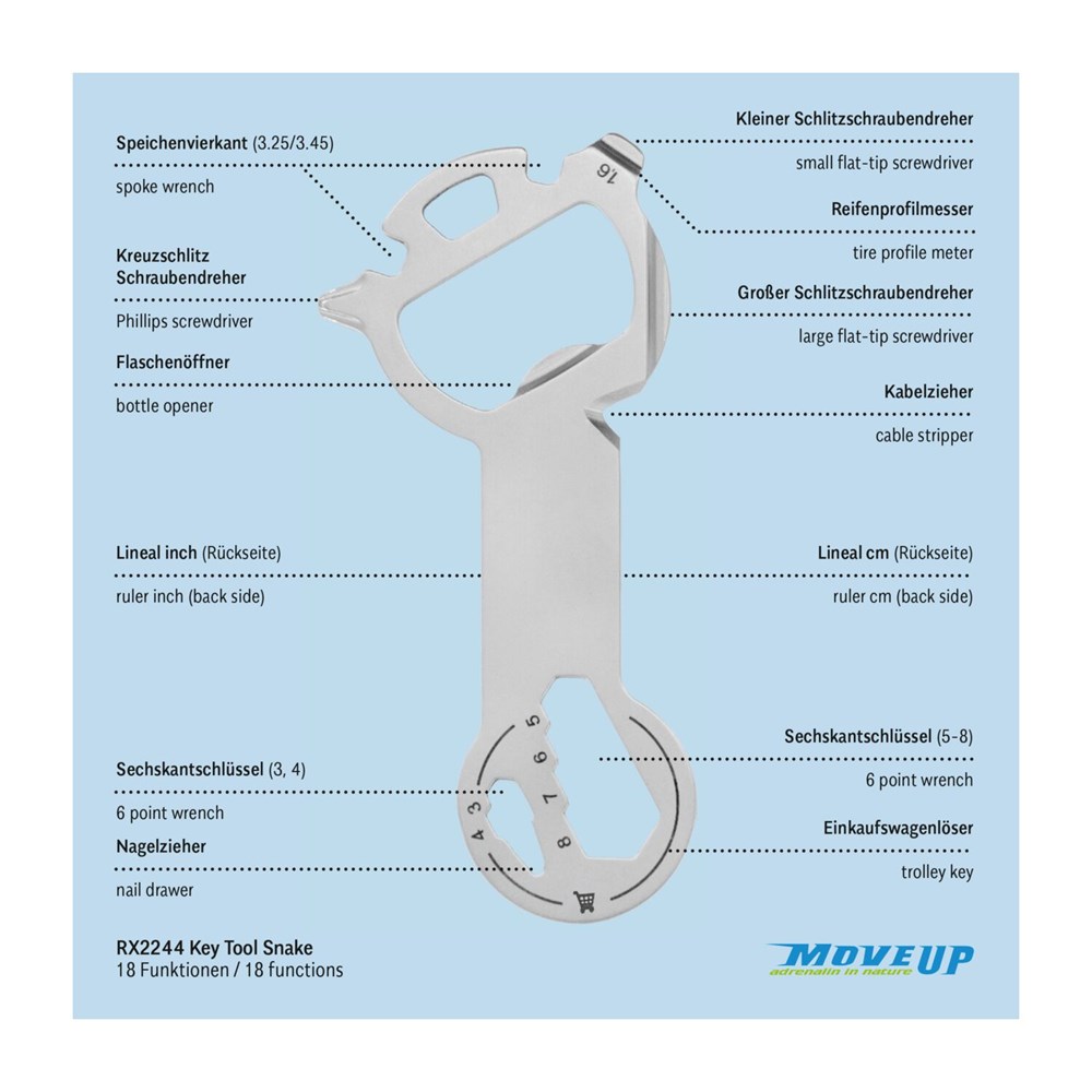 Multitool (aus robustem Edelstahl) für den Schlüsselbund inkl. Funktionsbeschreibung und Standard-Kartonverpackung, kundenindividuelle Verpackung und Funktionsbeschreibung ab 100 Stück möglich. In verschiedenen Standarddesigns verfügbar. Key Tool als Schlüsselanhänger mit 19 Funktionen: 6 Sechskantschlüssel, 2 Speichenvierkant, 2 Schlitzschraubendreher, 1 Flaschenöffner, 1 Kreuzschlitzschraubendreher, 1 Nagelzieher, 1 Einkaufswagenlöser, 1 Kabelzieher, 1 Zentimeter Lineal, 1 Inch Lineal, 2 Reifenprofilmesser (1,6 und 4 mm) - ab 3.000 Stück auch als Sonderproduktion mit individueller Key Tool Form möglich. Sprechen Sie uns an!