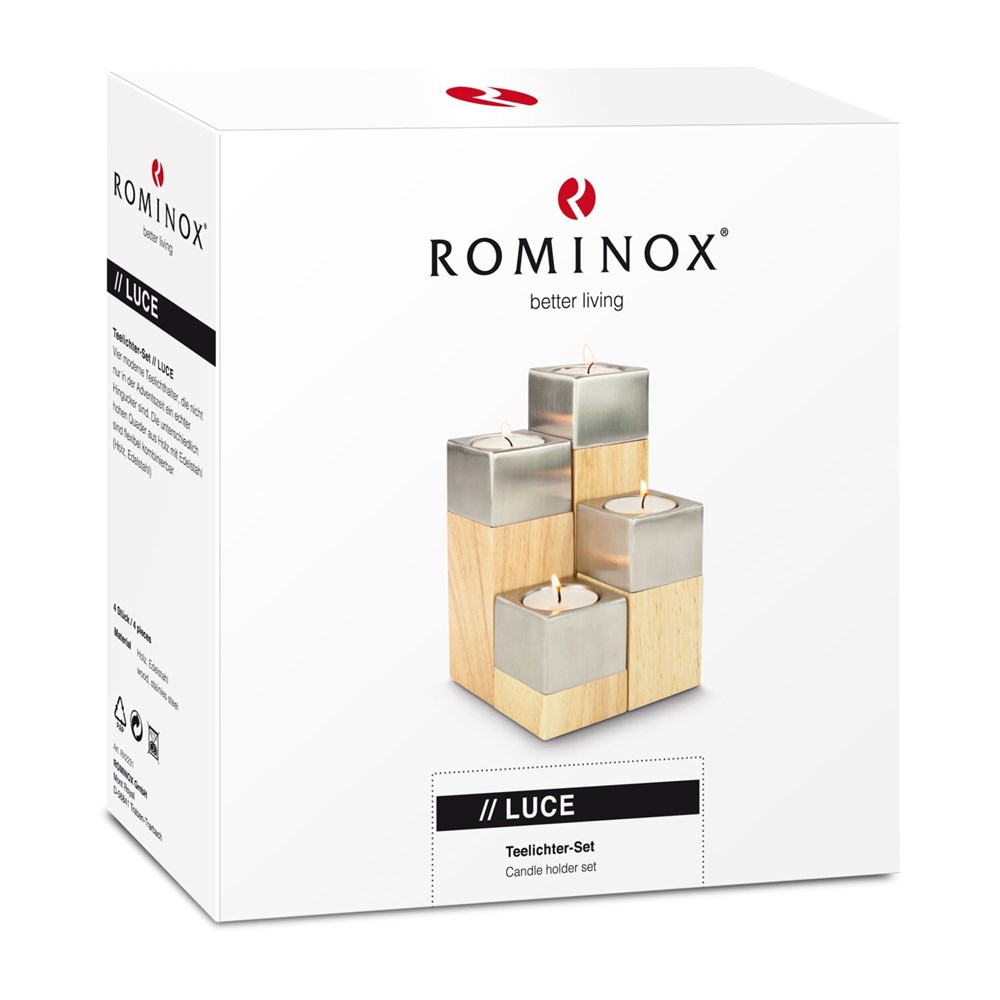 Vier Teelichthalter in modernem Design, flexibel kombinierbar und ganzjährig einsetzbar, ideal zur Adventszeit, Höhe: 5,5 / 9,2 / 12 / 12,2 cm (Holz, Edelstahl, ohne Teelicht)