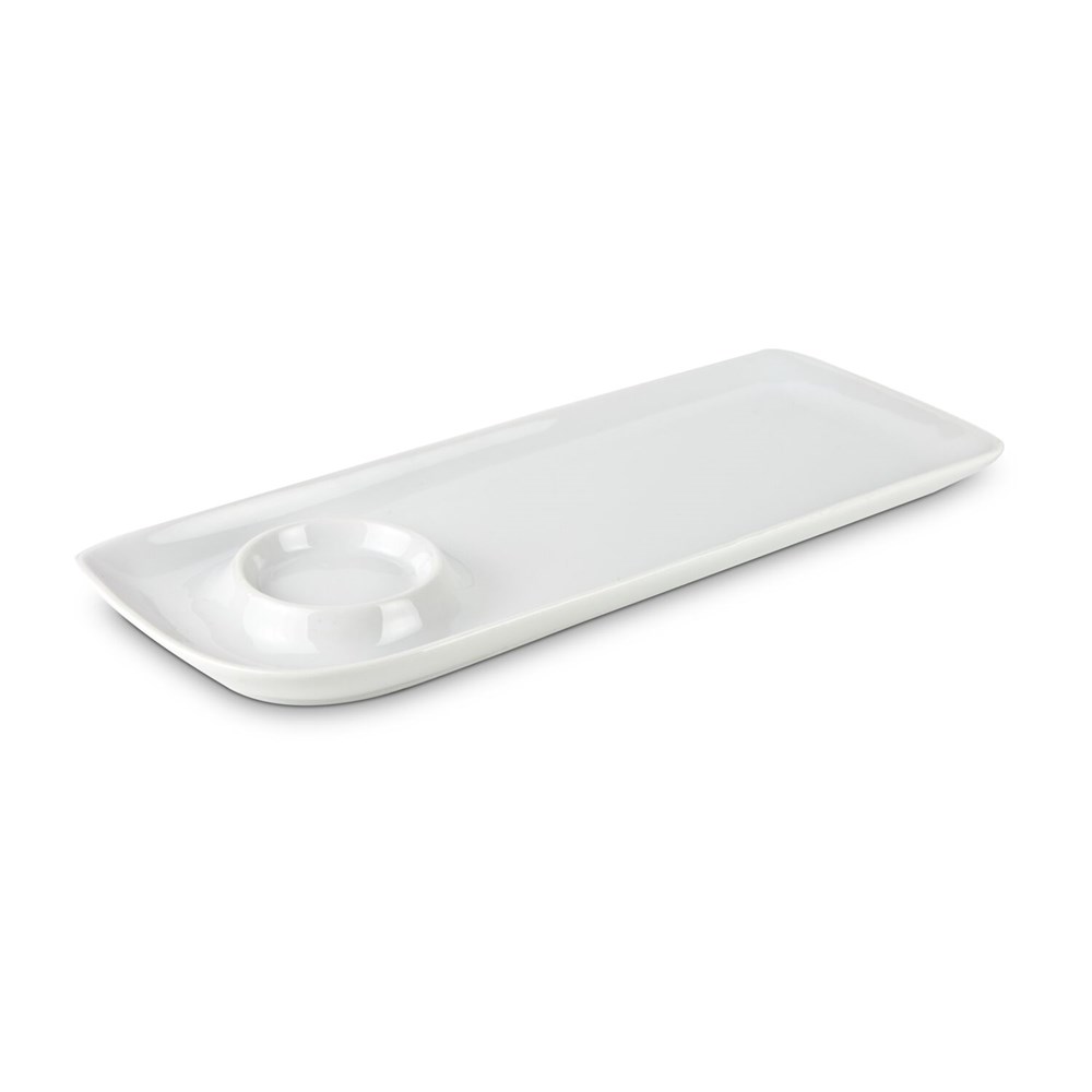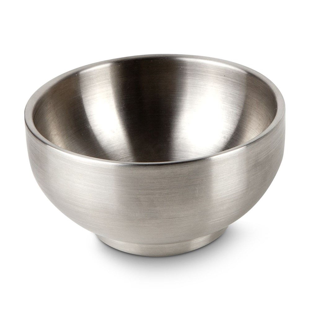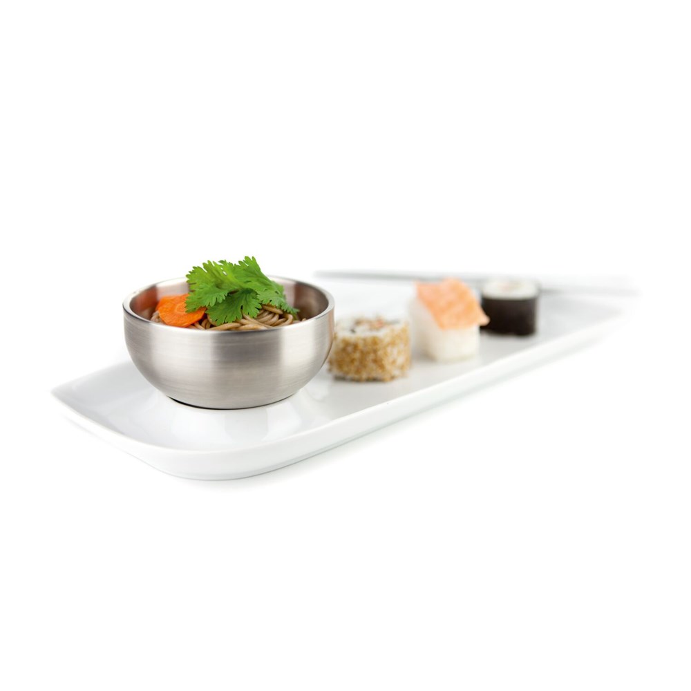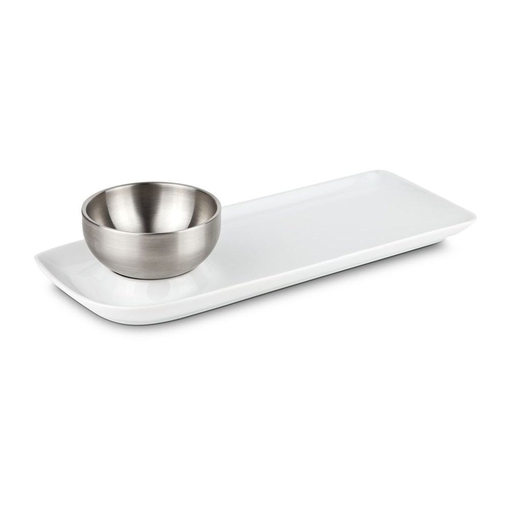 Funktional gestalteter Servierteller mit integrierter Schale (ca. Ø 9,5 x 4,5 cm) aus Edelstahl für Beilagen, Suppen, Soßen oder Dips - praktisch und unkonventionell (Porzellan, Edelstahl)