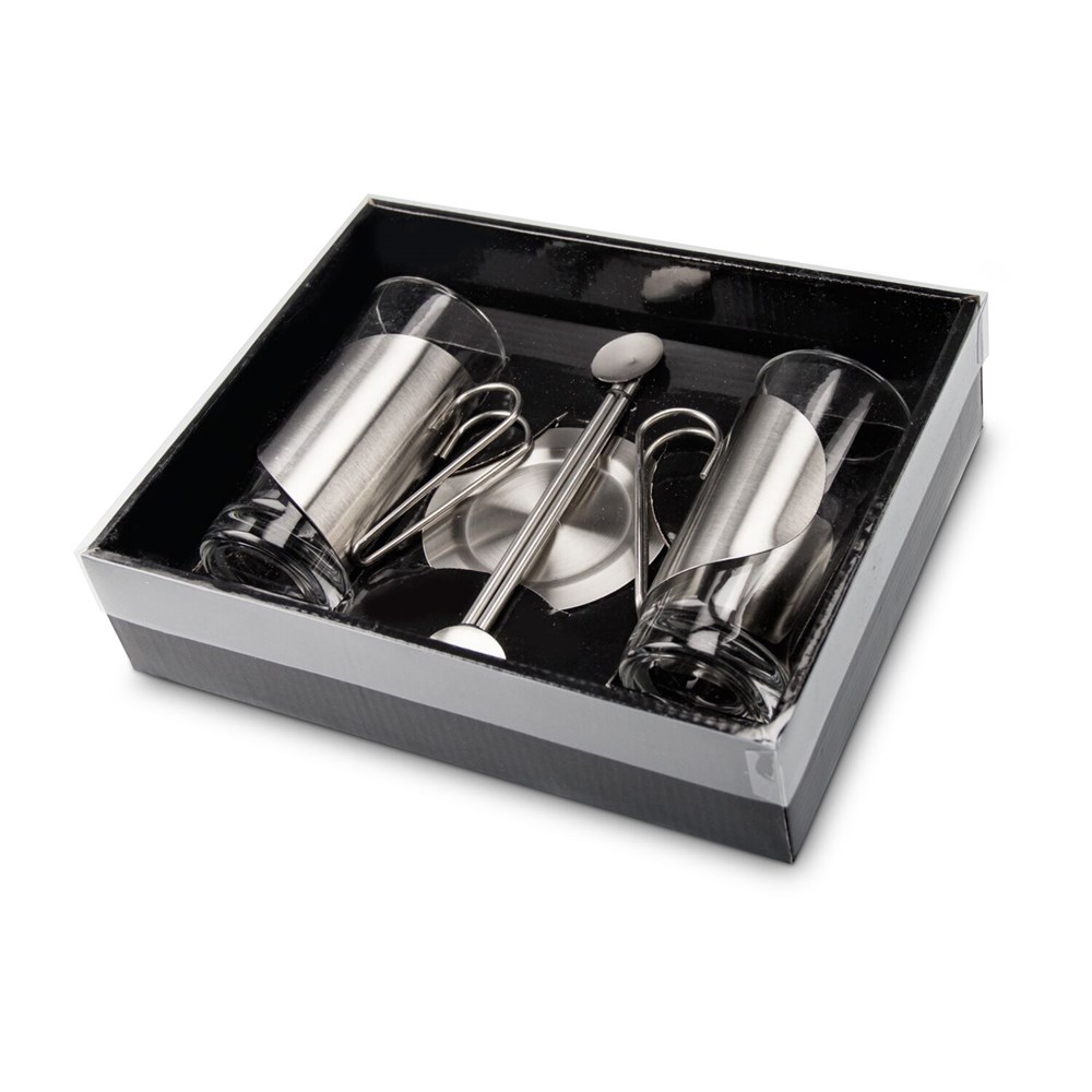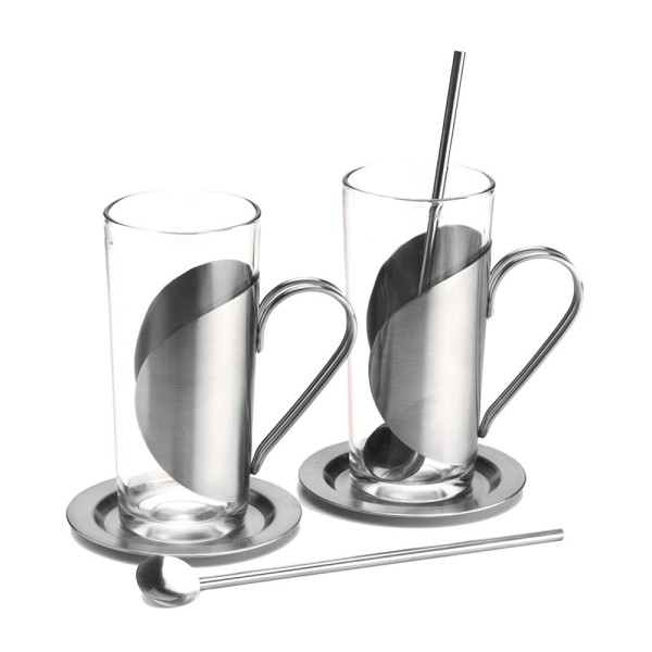 2 Teegläser mit klarer, linearer Formensprache, liegen sicher und ohne Hitzeübertragung in der Hand, inklusive 2 Untersetzer und 2 Trinkhalmlöffel, 6-teilig (hitzebeständiges Glas, Edelstahl - seidenmatt gebürstet)