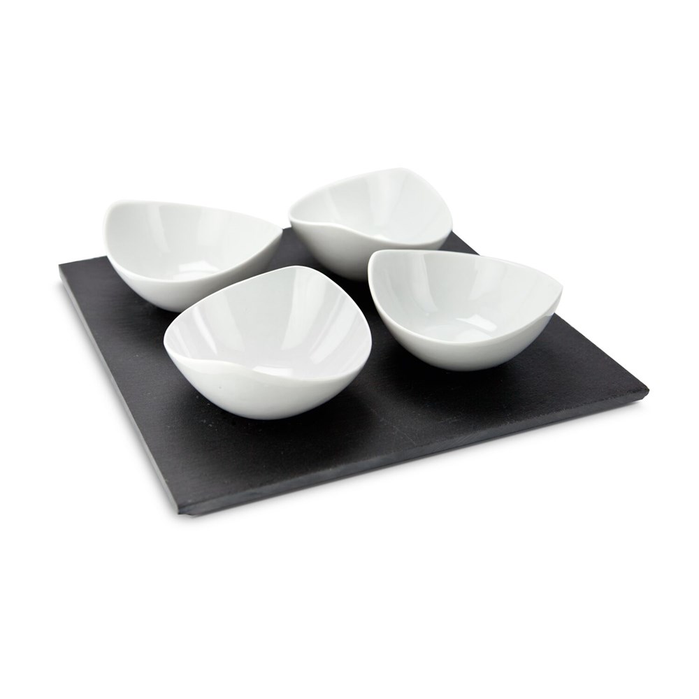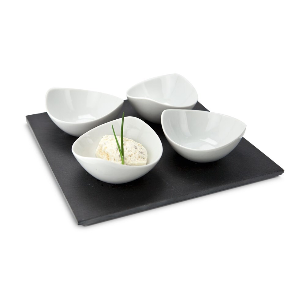 4 schwungvolle, helle Schalen (je ca. 10 x 10 x 4 cm) in spannendem Kontrast zur geradlinigen, dunklen Schieferplatte (ca. 25 x 25 x 0,7 cm), ideal zum Servieren von Dips, Soßen oder Marmeladen, Schutzgleiter auf der Unterseite (Schiefer, Keramik)