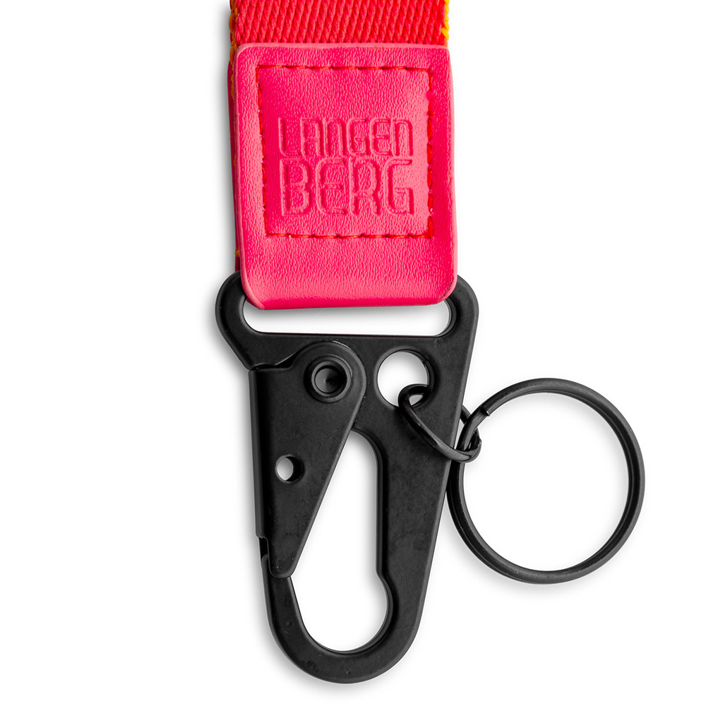 Ausstattung: PU Label D-715, kleiner Schlüsselring schwarz, Schlüsselring A-001 in schwarz, Karabiner A-211 in schwarz, Farbe des Bandes ähnlich Pantone möglich