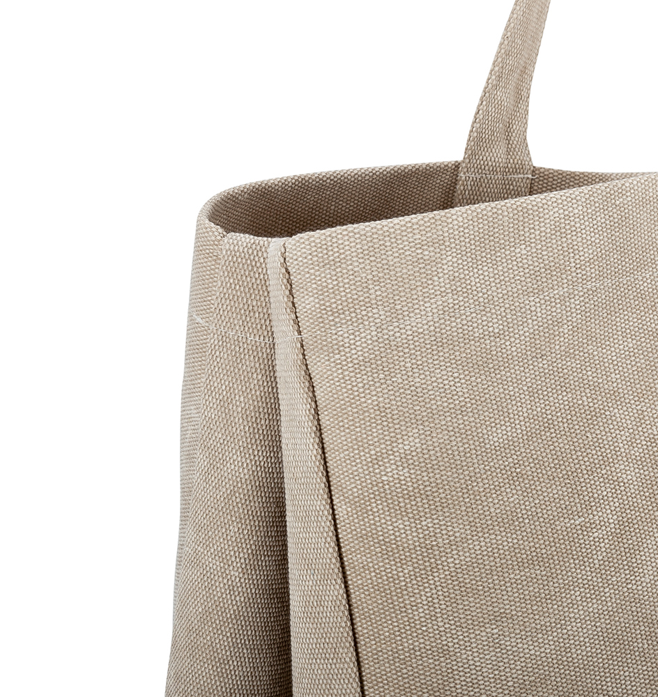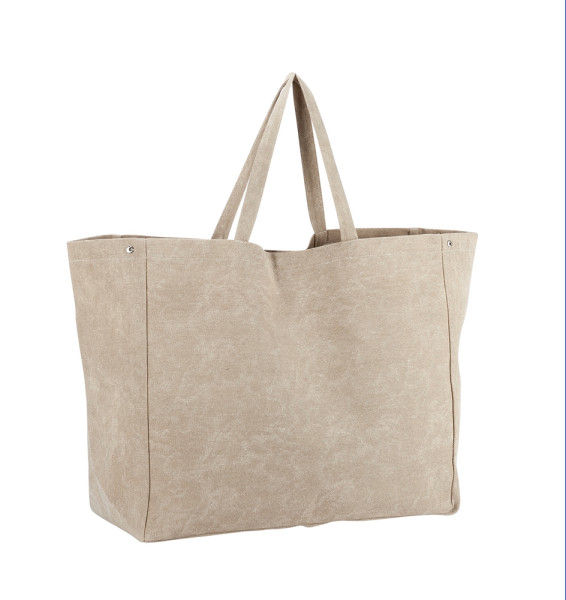 Die Tasche besteht aus Polyester-Canvas und verfügt über ein offenes Hauptfach, das mit einem Magnetknopf verschlossen wird. Sie ist mit einem Druckknopf verkleinerbar und hat eine kleine offene Innentasche. Mit einem Volumen von ca. 75 l bietet die Tasche viel Stauraum und Flexibilität.