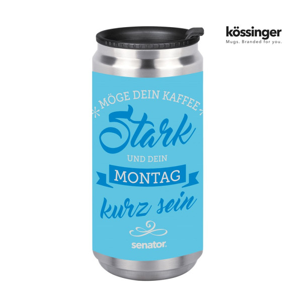 Kössinger King Can Vakuumthermodose, Vakuum-Thermodose aus doppelwandigem 18/8 Edelstahl mit schwarzem Kunststoffdeckel, Abmessungen Höhe: ca. 149 mm, Durchmesser: ca. 71 mm, Füllmenge: ca. 0,33 l - Vakuum-Thermobecher für den Trend zu To Go Bechern - Geschütztes Design in der Form einer handelsüblichen Getränkedose - Doppelwandiges Edelstahl: hält Heißgetränke länger warm und