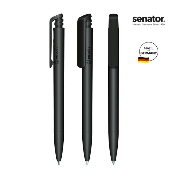 senator® Trento Matt Recycled Druckkugelschreiber. Nachhaltige, intelligente Recycling-Power. Druckkugelschreiber aus >95 % R-ABS-Recyclingmaterial, matt opak. Klimaneutrales Produkt produziert mit CO2-neutralem Ökostrom. Made in Germany. Langlebige senator® magic flow G2 Mine (1,0 mm), Schreiblänge bis zu 5000 m, Tintenfarbe: Blau. Option einer kostenlosen Ersatzmine unter minen.senator.com.