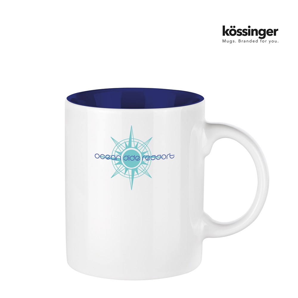 Kössinger Keramiktasse Carina - Werbetasse mit Farbkontrast. Aussen klassisch weiß, innen und am Henkel mit farbiger Glasur, ist dieser klassische Henkelbecher ein Hingucker, dessen großer Druckbereich für eine Vielzahl von Werbemöglichkeiten- und Ideen passt.