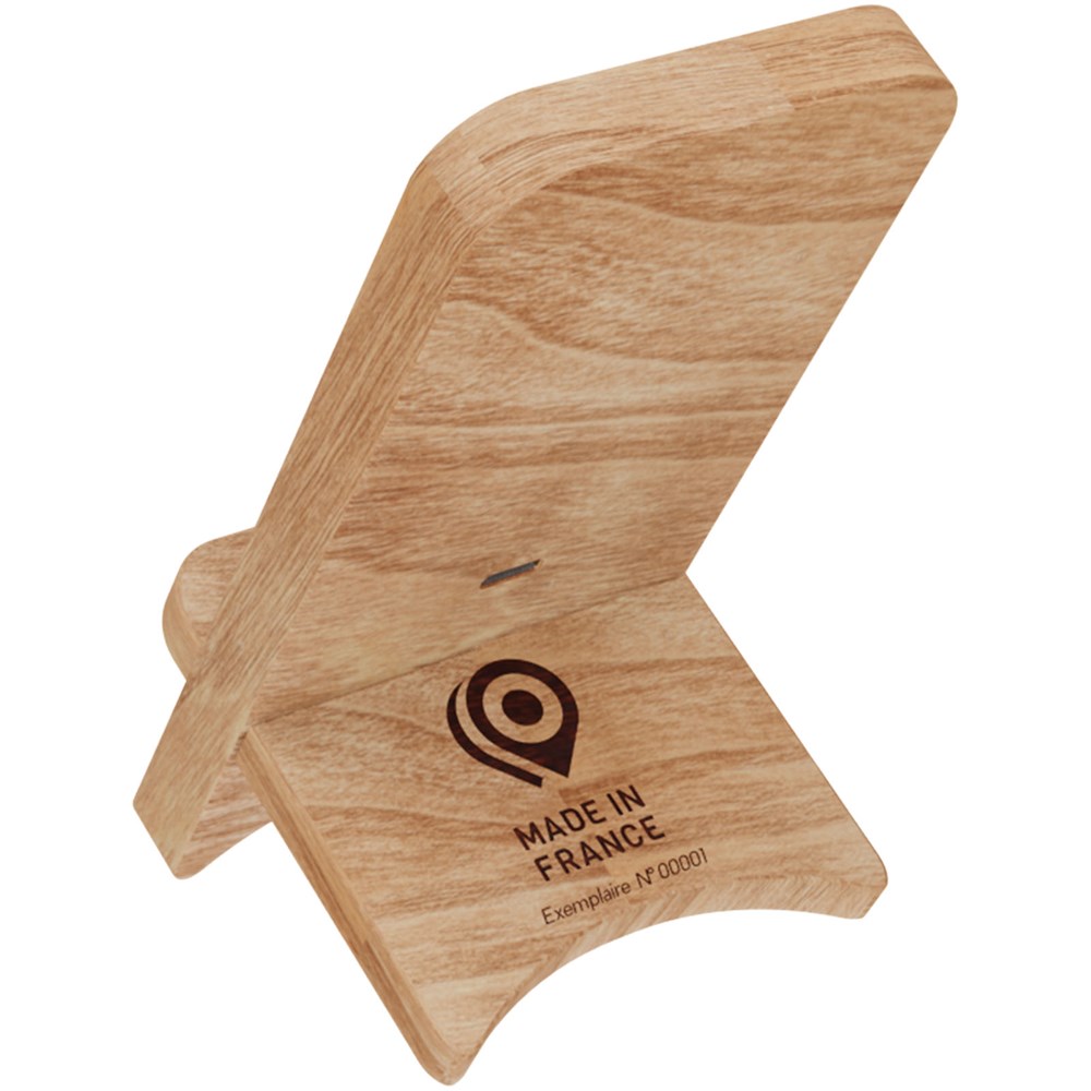 Kabellose 10W Ladestation, hergestellt in der EU aus französischem Eichenholz mit Soft-Touch Oberfläche. Hergestellt von einem Schreiner in Nordfrankreich, wird sie dann zusammengebaut und individuell angepasst (ebenfalls in Frankreich). Dank des doppelten kabellosen Sensors können Geräte sowohl in vertikaler als auch in horizontaler Position aufgeladen werden. Dieser Artikel kann mit einem leuchtenden Logo individuell gestaltet werden. Qi-kompatibel. Größe des Ständers: 4 × 7 × 1,2 cm. Verpackt in einer Geschenkbox aus recyceltem Papier (15 × 8 × 2,7 cm) mit Magnetverschluss. Inklusive 3 Jahre Garantie.