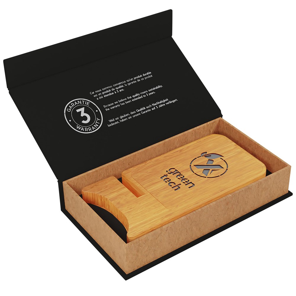 10W kabellose Telefonladestation (14 x 7 x 1,2 cm) aus Ahornhol, der aus nachhaltigen, umweltfreundlichen und sozialverträglichen Quellen stammt. Die Holzoberfläche eignet sich perfekt für eine Lasergravur, die das Logo aufleuchten lässt, wenn die Telefonladestation angeschlossen ist. Die Ladestation verfügt über 2 drahtlose Sensoren, sodass das Smartphone sowohl in vertikaler als auch in horizontaler Position aufgeladen werden kann. Wird mit einem Ladekabel aus rPET geliefert. Verpackt in einer Geschenkbox (15,9 x 8,9 x 3,2 cm) mit Magnetverschluss. Inklusive 3 Jahre Garantie.