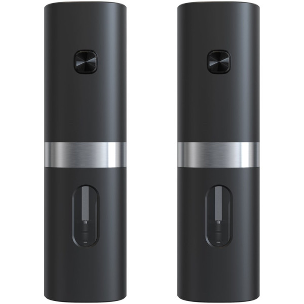 Elektrische Salz- und Pfeffermühle mit blauem LED-Licht, das beim Einschalten leuchtet. Jede Mühle (17,8 x 5,1 cm) ist mit einem Akku ausgestattet, der direkt an der Basis aufgeladen werden kann. Der Sockel kann auch mit einem leuchtenden Logo personalisiert werden. Beide Mühlen sind mit einem transparenten Behälter ausgestattet, damit der Inhalt leicht zu erkennen ist. Mit einer einzigen Ladung kann eine Mühle etwa 200 Mal verwendet werden. Im Lieferumfang enthalten ist eine Ladestation (15,5 x 8 x 2,5 cm) mit Soft-Touch-Oberfläche aus Gummi. Wird in einer Geschenkbox aus recyceltem Kraftpapier (17,7 x 23,4 x 8,5 cm) geliefert. Inklusive 3 Jahre Garantie.