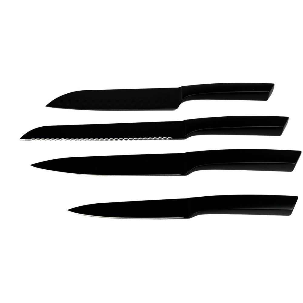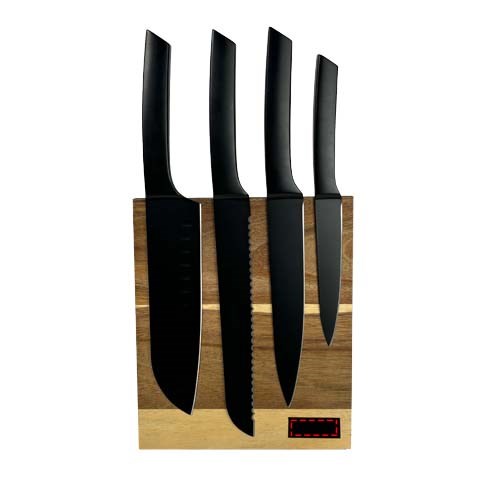 Set aus 4 Küchenmessern und einem Holzschneidebrett (18 × 21,4 × 3 cm). Das Set enthält 1 Brotmesser (20 cm), 1 Santokumesser (17,8 cm), 1 Tranchiermesser (17,8 cm) und 1 Universalmesser (12,7 cm). Das Schneidebrett ist magnetisch, hat einen klappbaren Ständer und verfügt über eine schwarze Metallplatte zum Bedrucken. Wird in einer Geschenkbox aus recyceltem Karton geliefert (21,5 × 38,5 × 4,5 cm).