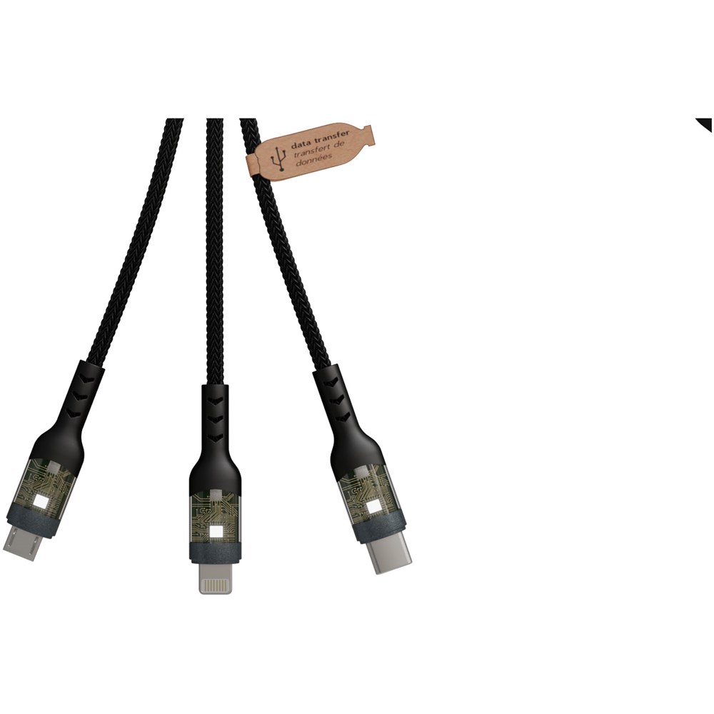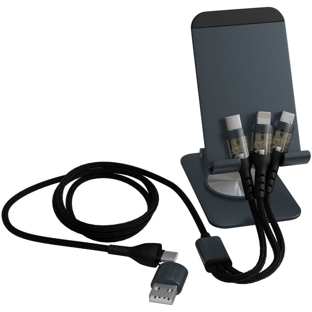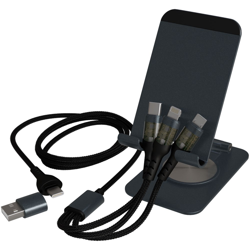 Faltbare Telefonladestation, die um 360° gedreht werden kann, geliefert mit einem 3-in-1-Ladekabel (Typ-C, iPhone, Micro-USB). Wird in einer Geschenkbox aus recyceltem Karton geliefert (12 × 8,4 × 5 cm).