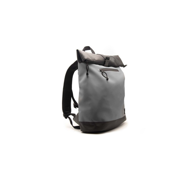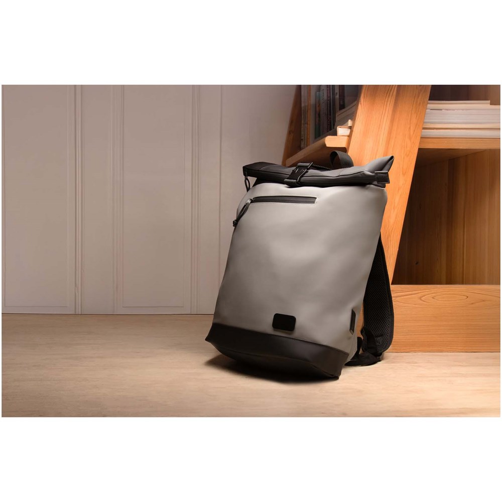 Rucksack mit einer Tasche auf der Vorderseite und einem wasserdichten Reißverschluss, sowie gepolsterten Fächern für einen Laptop oder ein Tablet. Formstabile Struktur und gepolsterter Boden für optimalen Schutz des Tascheninhalts. Geliefert in einem Vliesstoffbeutel.