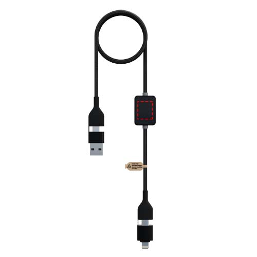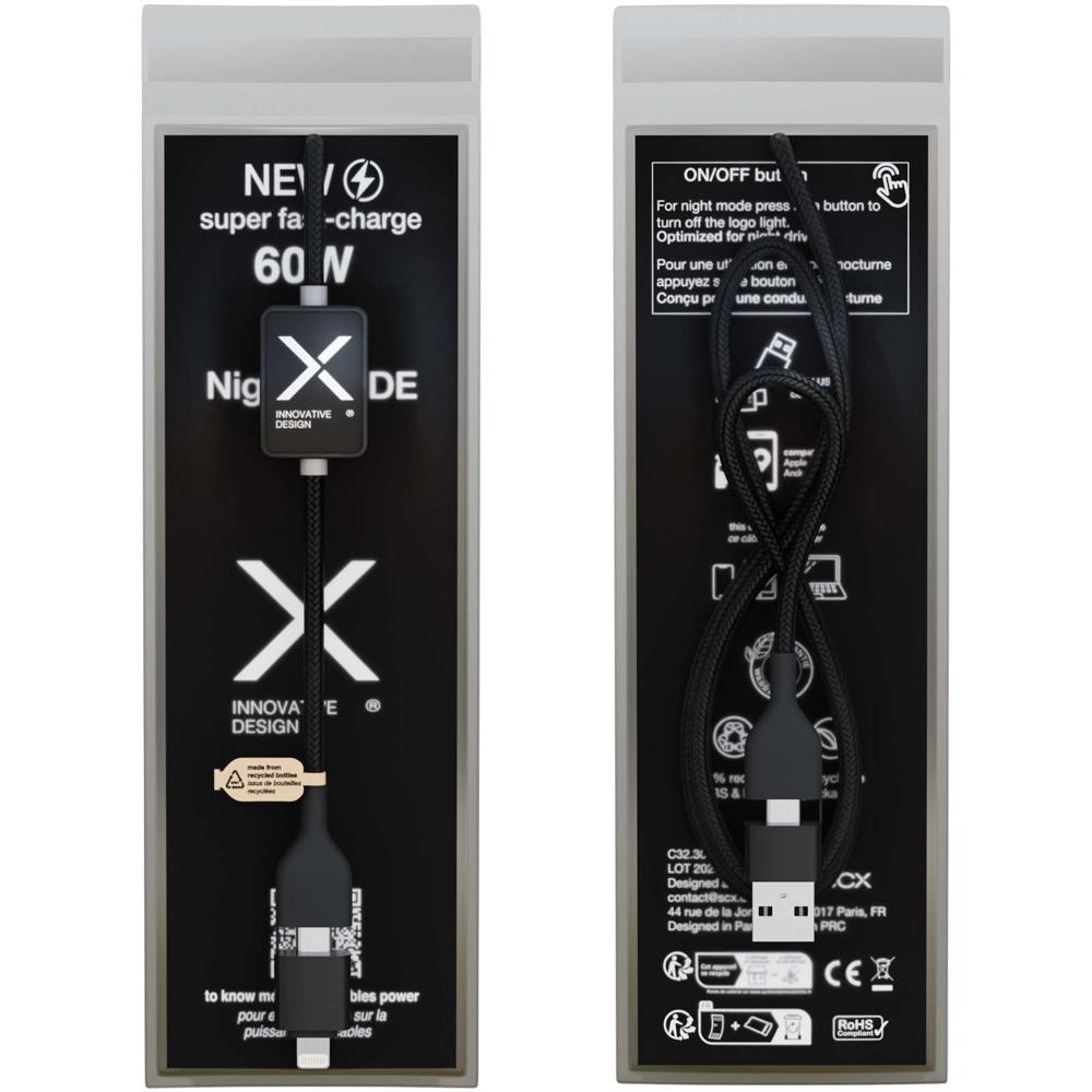Dieses 1 Meter lange Schnellladekabel mit 60W Leistung verfügt über ein Leuchtlogo sowie einen Schalter, mit dem sich das Licht nachts ausschalten lässt. Es eignet sich somit ideal für das Schlafzimmer oder das Auto. Zur Datenübertragung mit Apple CarPlay und Android Auto geeignet. Es bietet Type-C- und Lightning-Anschlüsse sowie doppelte USB-A- und USB-C-Eingänge für universelle Kompatibilität, auch mit den neuesten MacBook-Modellen. Das Kabel besteht aus recyceltem ABS/PET Kunststoff und Aluminium. An einem Ende ist Soft-Touch-Gummi verarbeitet, am anderen satinierter recycelter Kunststoff. Verpackt in einer recycelbaren TPU-Hülle mit Rückseite aus Karton.
