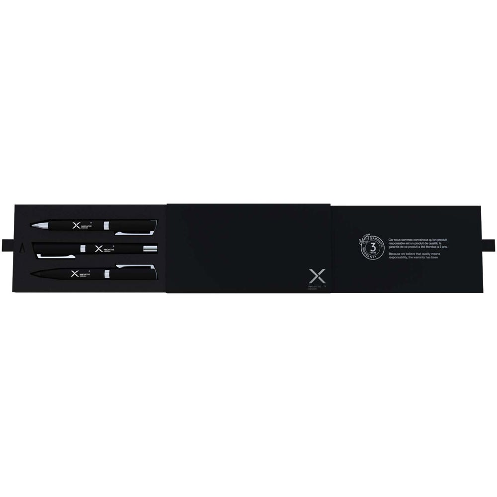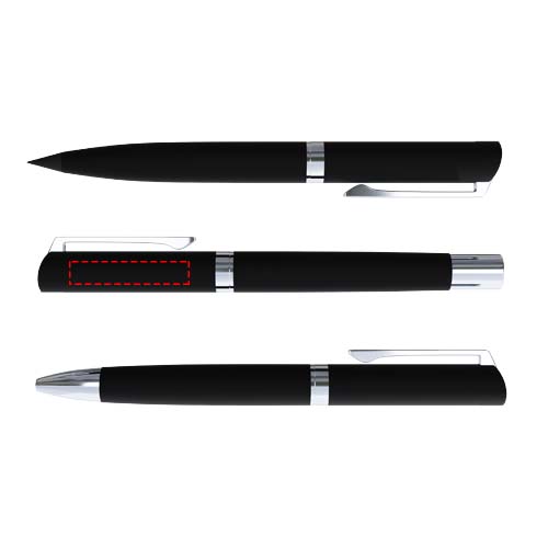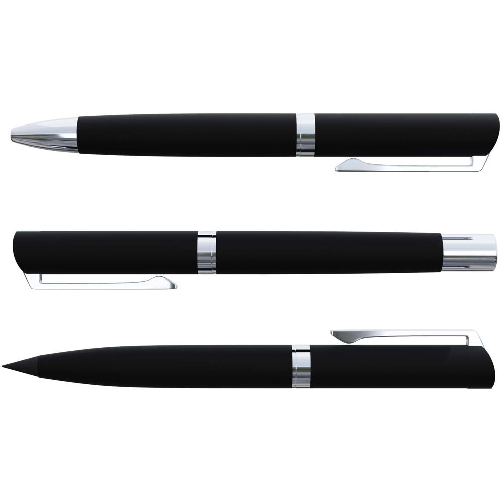 Dieses elegante dreiteilige Stift-Set aus Aluminium mit Soft-Touch-Oberfläche sorgt für ein geschmeidiges Schreibgefühl auf verschiedensten Untergründen. Das Set enthält einen Kugelschreiber mit hochwertiger blauer Dokumental®-Tinte aus Deutschland, 1800 m Schreibleistung und einer Wolframkarbid-Spitze für präzises Schreiben. Der Tintenroller verwendet schwarze Dokumental®-Tinte mit Schreibkapazität von 400 Metern – ideal für flüssiges, sauberes Schreiben. Der Grafitstift bietet eine Schreibleistung von bis zu 5000 m – perfekt für Skizzen und Notizen. In der Geschenkbox befindet sich im oberen Fach für jedes Schreibgerät ein Ersatzteil: blaue Tinte für den Kugelschreiber (bis zu 2 Jahre), schwarze Tinte für den Tintenroller (bis zu 6 Monate) und eine Ersatzmine für den Stift (bis zu 3 Jahre). Individuell gestaltbar per Lasergravur mit Metallic-Effekt. Geliefert in einer Geschenkbox mit Schiebedeckel aus recyceltem Karton.