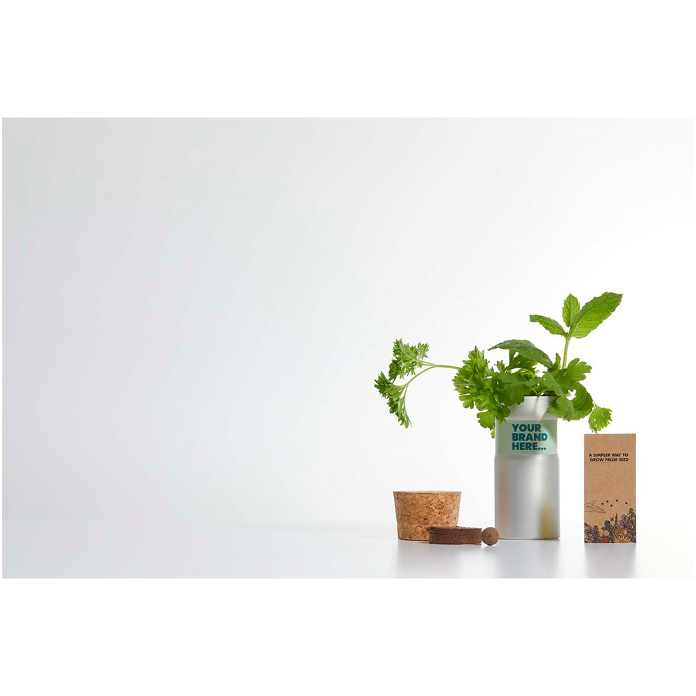 Dieser kompakte Garten für den Schreibtisch besteht aus gebürstetem recyceltem Aluminium. Er enthält eine innovative Samenkugel mit einer bienenfreundlichen Blumenmischung ( Kleeblatt, Fingerhut, Rotklee, Kreuzkraut und wilder Majoran), die in 1 bis 2 Wochen keimt. Die Packung umfasst einen Korkstopfen, eine Anbauanleitung und organische Erdtabletten. Und wenn Ihre Pflanzen groß geworden sind, können Sie den Topf zum Weiterkultivieren, Lagern oder Recyceln wiederverwenden. Geliefert in einer Geschenkbox, die auch bedruckt werden kann. Hergestellt in Europa.