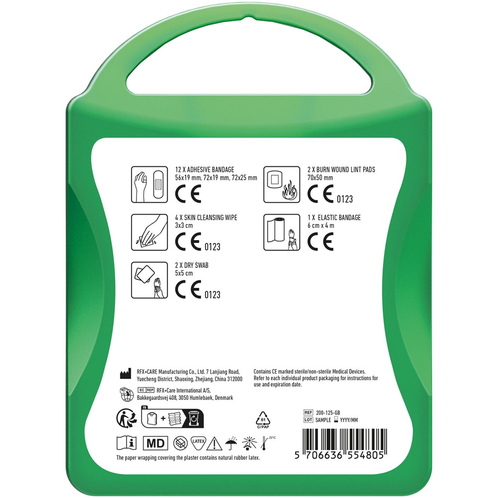 Dieses klassische Erste-Hilfe Set ist perfekt geeignet für den Gebrauch zu Hause oder im Auto, um bei Verletzungen und Unfällen vorbereitet zu sein. Inhalt: 12 wasserfeste Pflaster, 4 hautreinigende Tupfer, 2 Trockentupfer, 1 elastischer Verband, 2 Mullbinden für Brandwunden. Alle im Set enthaltenen Erste-Hilfe- und Pflegeprodukte erfüllen alle geltenden EU-Vorschriften. Preis inkl. vollfarbigem Druck.