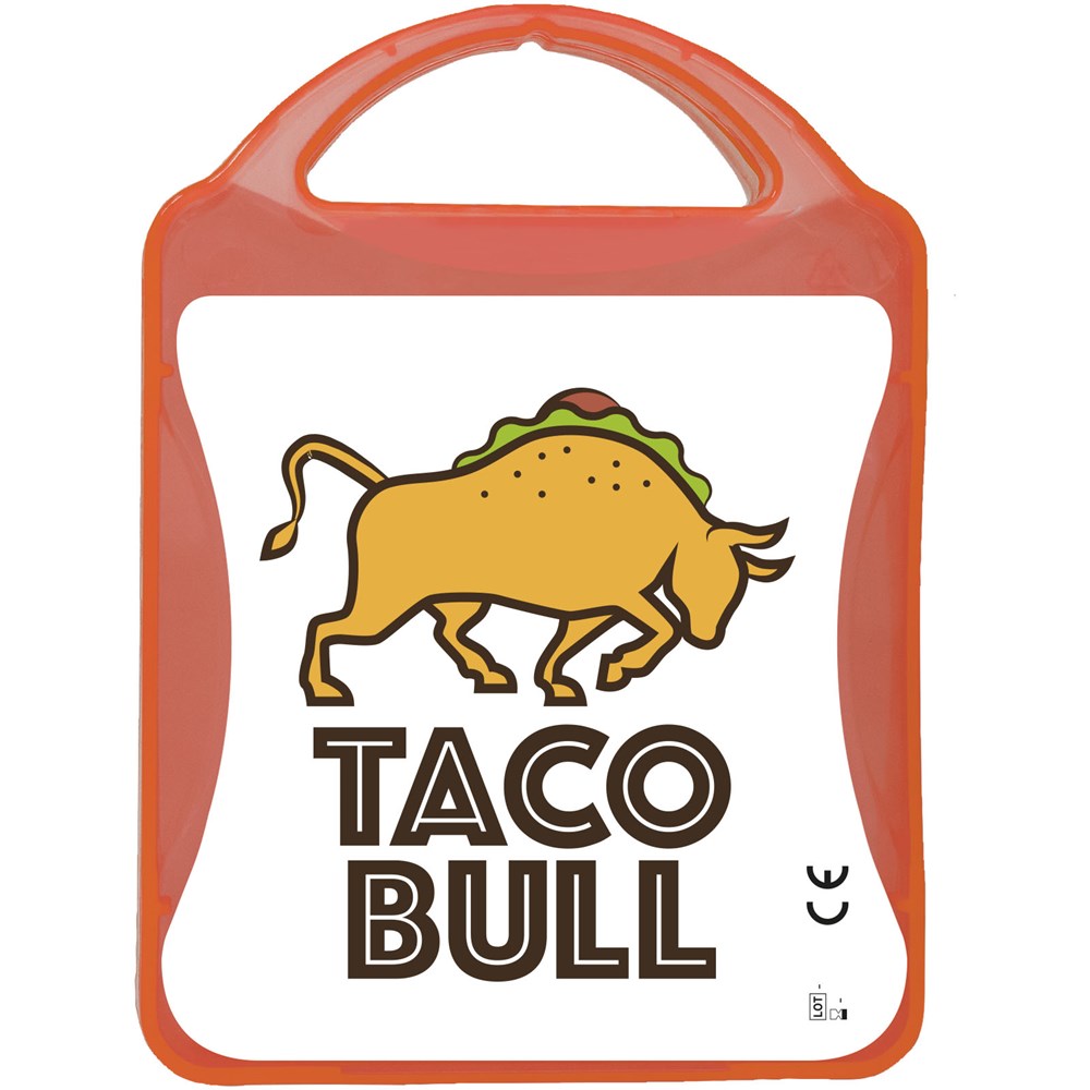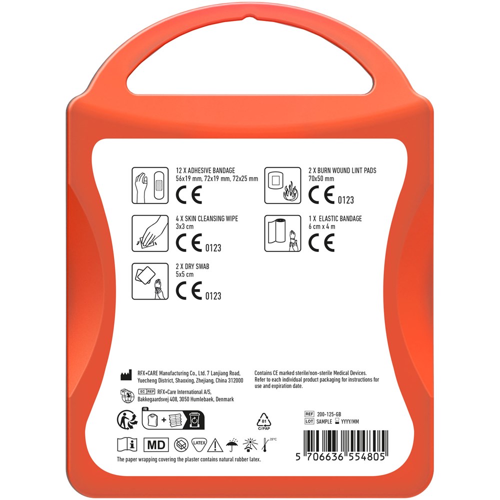 Dieses klassische Erste-Hilfe Set ist perfekt geeignet für den Gebrauch zu Hause oder im Auto, um bei Verletzungen und Unfällen vorbereitet zu sein. Inhalt: 12 wasserfeste Pflaster, 4 hautreinigende Tupfer, 2 Trockentupfer, 1 elastischer Verband, 2 Mullbinden für Brandwunden. Alle im Set enthaltenen Erste-Hilfe- und Pflegeprodukte erfüllen alle geltenden EU-Vorschriften. Preis inkl. vollfarbigem Druck.