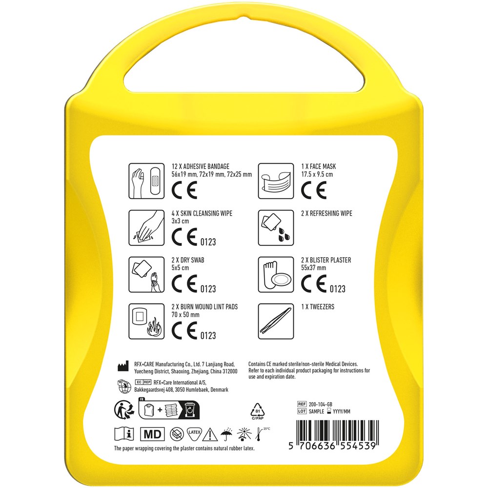 Ideales Erste-Hilfe Set an Ihrem Arbeitsplatz. Dieses Set sollte an jedem Arbeitsplatz vorrätig sein, um kleine Verletzungen und Notfälle zu behandeln. Inhalt: 12 wasserfeste Pflaster, 4 hautreinigende Tupfer, 2 Trockentupfer, 1 Mundschutz, 2 Blasenpflaster, 2 Mullbinden für Brandwunden, 2 Reinigungstücher, 1 Pinzette. Alle im Set enthaltenen Erste-Hilfe- und Pflegeprodukte erfüllen alle geltenden EU-Vorschriften. Preis inkl. vollfarbigem Druck.