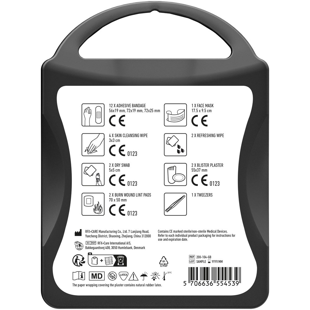 Ideales Erste-Hilfe Set an Ihrem Arbeitsplatz. Dieses Set sollte an jedem Arbeitsplatz vorrätig sein, um kleine Verletzungen und Notfälle zu behandeln. Inhalt: 12 wasserfeste Pflaster, 4 hautreinigende Tupfer, 2 Trockentupfer, 1 Mundschutz, 2 Blasenpflaster, 2 Mullbinden für Brandwunden, 2 Reinigungstücher, 1 Pinzette. Alle im Set enthaltenen Erste-Hilfe- und Pflegeprodukte erfüllen alle geltenden EU-Vorschriften. Preis inkl. vollfarbigem Druck.