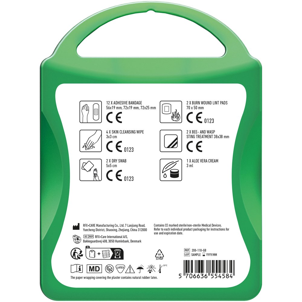 Ideales Erste-Hilfe Set um sich vor Bissen und Stichen von Insekten zu schützen oder Ihre Haut zu pflegen. Inhalt: 12 wasserfeste Pflaster, 4 hautreinigende Tupfer, 2 Trockentupfer, 2 Mullbinden für Brandwunden, 1 Bienen- /Wespenpflaster, 1 Aloe Vera Creme. Alle im Set enthaltenen Erste-Hilfe- und Pflegeprodukte erfüllen alle geltenden EU-Vorschriften. Preis inkl. vollfarbigem Druck.
