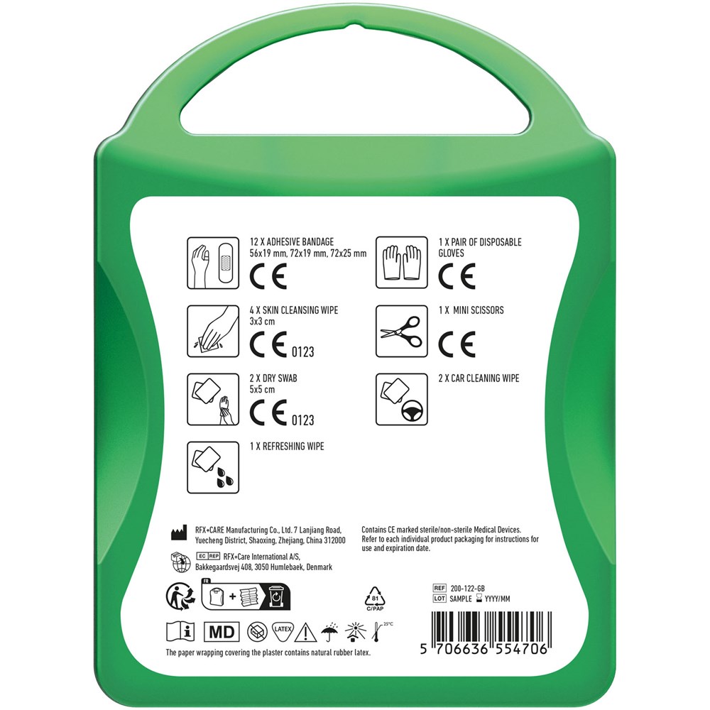 Ideales Erste-Hilfe Set in jedem Auto. Mit diesem Set können Sie kleine Unfälle und Verletzungen sofort behandeln. Inhalt: 12 wasserfeste Pflaster, 2 hautreinigende Tupfer, 2 Trockentupfer, 1 Paar Einmalhandschuhe, 1 Car clean (2er Pack), 1 Reinigungstuch, 1 Mini Schere. Alle im Set enthaltenen Erste-Hilfe- und Pflegeprodukte erfüllen alle geltenden EU-Vorschriften. Preis inkl. vollfarbigem Druck.