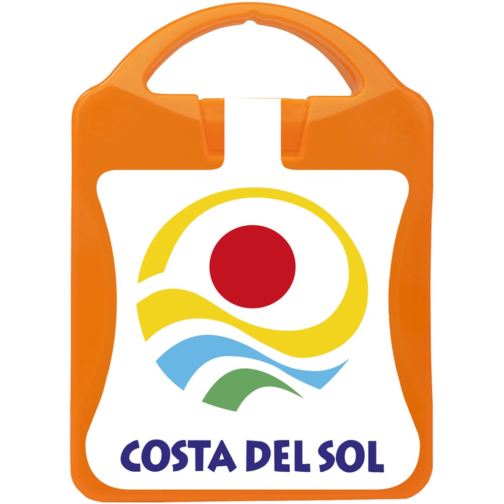 Ideales Erste-Hilfe Set in jedem Auto. Mit diesem Set können Sie kleine Unfälle und Verletzungen sofort behandeln. Inhalt: 12 wasserfeste Pflaster, 2 hautreinigende Tupfer, 2 Trockentupfer, 1 Paar Einmalhandschuhe, 1 Car clean (2er Pack), 1 Reinigungstuch, 1 Mini Schere. Alle im Set enthaltenen Erste-Hilfe- und Pflegeprodukte erfüllen alle geltenden EU-Vorschriften. Preis inkl. vollfarbigem Druck.