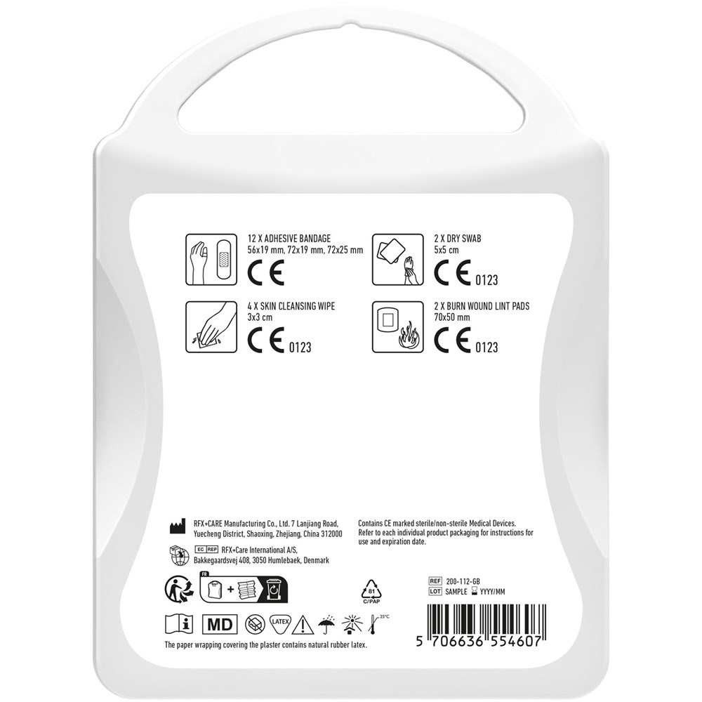 Erste-Hilfe Set für Reisende. Mit diesem Set sind Sie vorbereitet um Verletzungen während Ihrer Reise zu behandeln. Inhalt: 12 wasserfeste Pflaster, 4 hautreinigende Tupfer, 2 Trockentupfer, 2 Mullbinden für Brandwunden. Alle im Set enthaltenen Erste-Hilfe- und Pflegeprodukte erfüllen alle geltenden EU-Vorschriften. Preis inkl. vollfarbigem Druck.