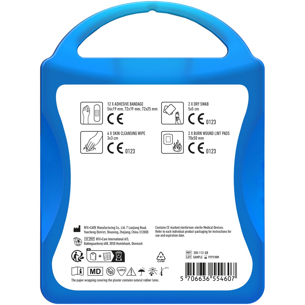 Erste-Hilfe Set für Reisende. Mit diesem Set sind Sie vorbereitet um Verletzungen während Ihrer Reise zu behandeln. Inhalt: 12 wasserfeste Pflaster, 4 hautreinigende Tupfer, 2 Trockentupfer, 2 Mullbinden für Brandwunden. Alle im Set enthaltenen Erste-Hilfe- und Pflegeprodukte erfüllen alle geltenden EU-Vorschriften. Preis inkl. vollfarbigem Druck.