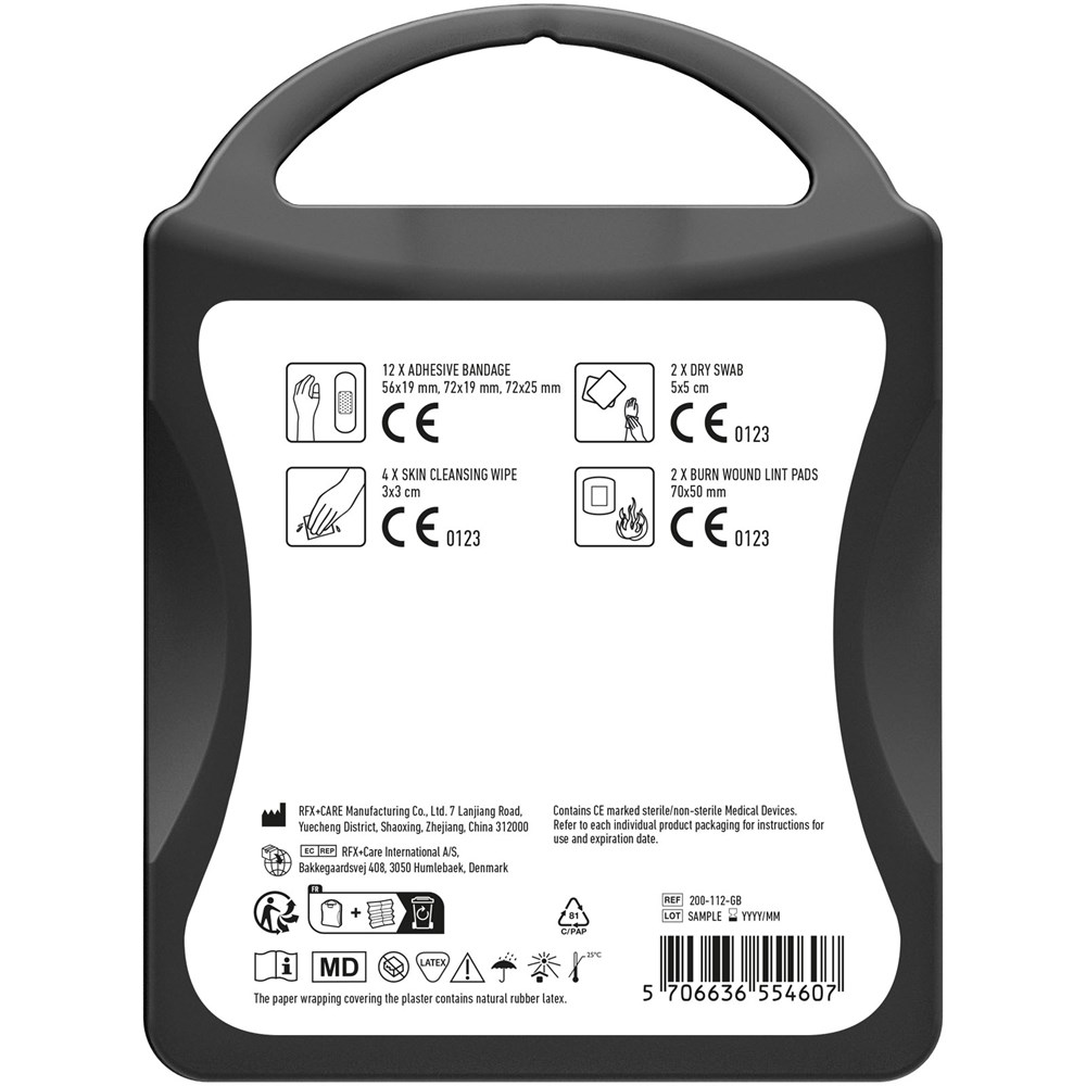Erste-Hilfe Set für Reisende. Mit diesem Set sind Sie vorbereitet um Verletzungen während Ihrer Reise zu behandeln. Inhalt: 12 wasserfeste Pflaster, 4 hautreinigende Tupfer, 2 Trockentupfer, 2 Mullbinden für Brandwunden. Alle im Set enthaltenen Erste-Hilfe- und Pflegeprodukte erfüllen alle geltenden EU-Vorschriften. Preis inkl. vollfarbigem Druck.