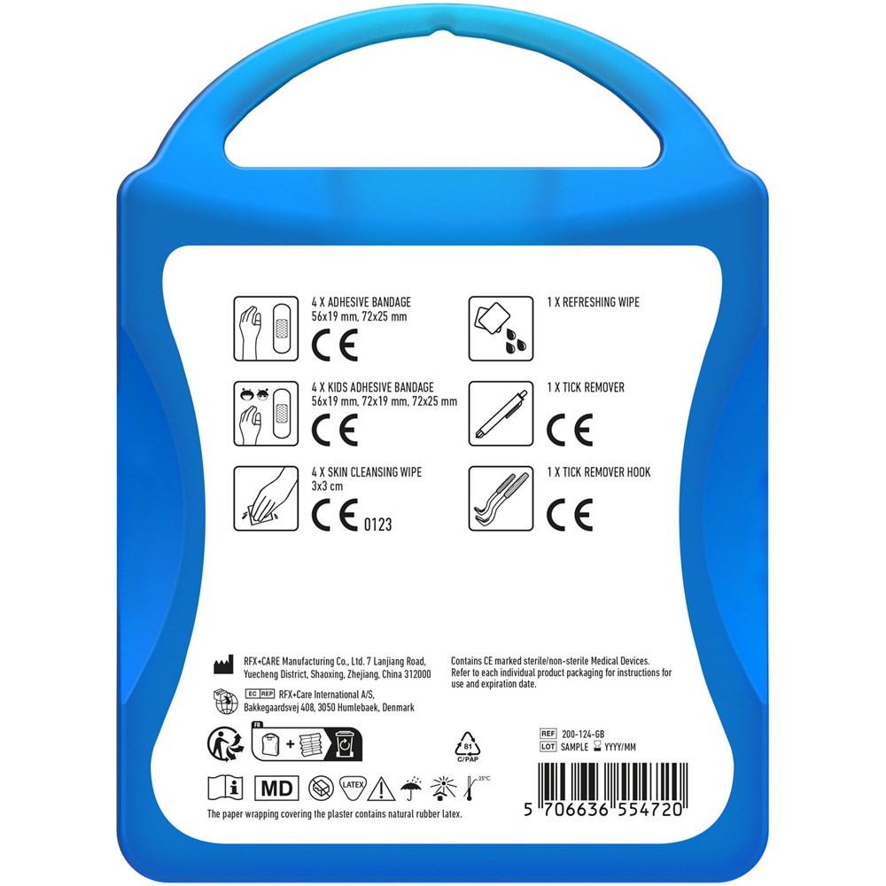 Ideales Set um Zecken zu entfernen und die Stiche zu behandeln. Inhalt: 4 wasserfeste Pflaster, 4 hautreinigende Tupfer, 1 Zeckenentferner blau (Menschen), 1 Zeckenzange (orange), 4 Kinderpflaster, 1 Reinigungstuch. Alle im Set enthaltenen Erste-Hilfe- und Pflegeprodukte erfüllen alle geltenden EU-Vorschriften. Preis inkl. vollfarbigem Druck.
