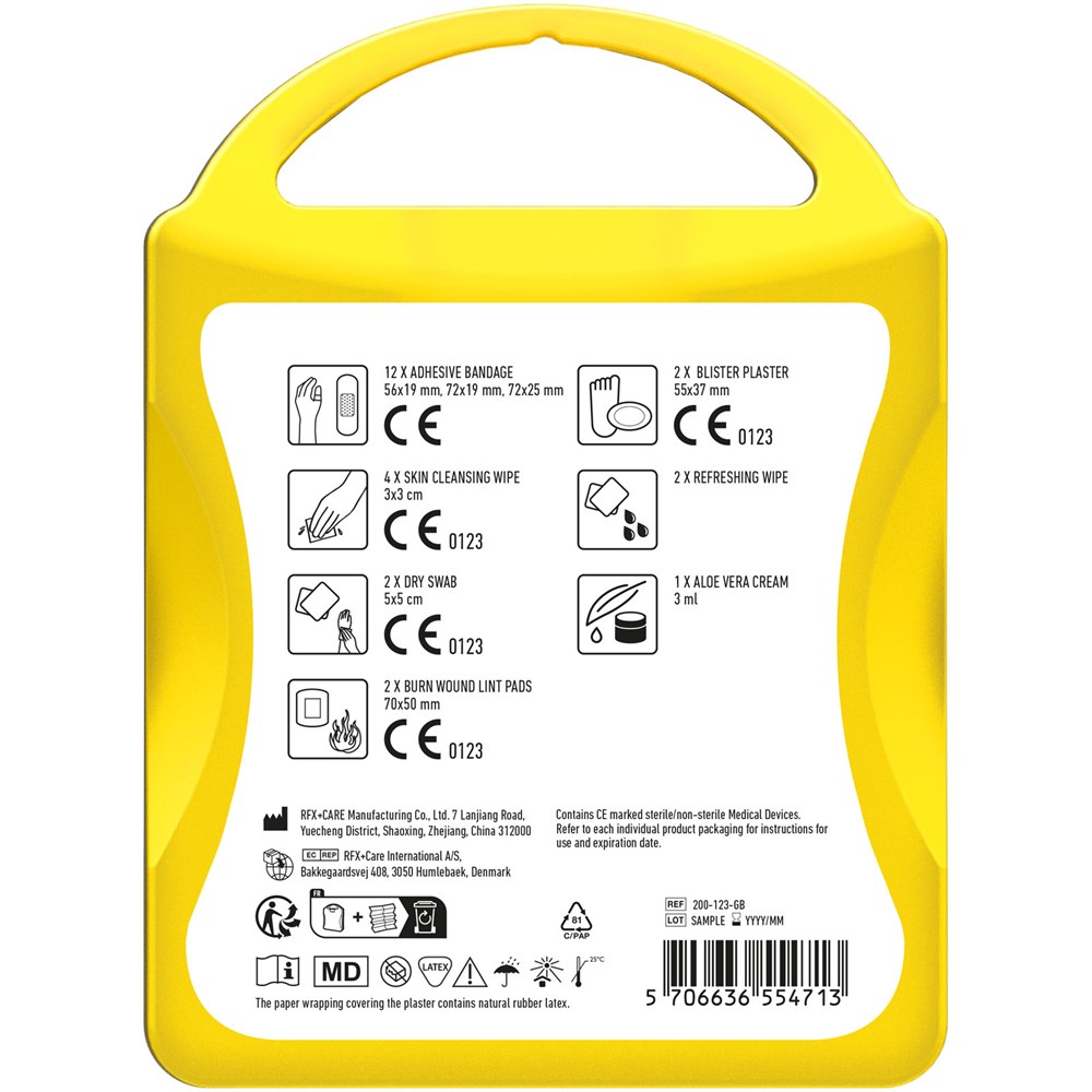 Ideales Erste-Hilfe Set für Reisende. Mit diesem umfangreichen Set sind Sie vorbereitet um Verletzungen während Ihrer Reise zu behandeln und pflegen. Inhalt: 12 wasserfeste Pflaster, 4 hautreinigende Tupfer, 2 Trockentupfer, 2 Mullbinden für Brandwunden, 1 Blasenpflaster, 2 Reinigungstücher, 1 Aloe Vera Creme. Alle im Set enthaltenen Erste-Hilfe- und Pflegeprodukte erfüllen alle geltenden EU-Vorschriften. Preis inkl. vollfarbigem Druck.