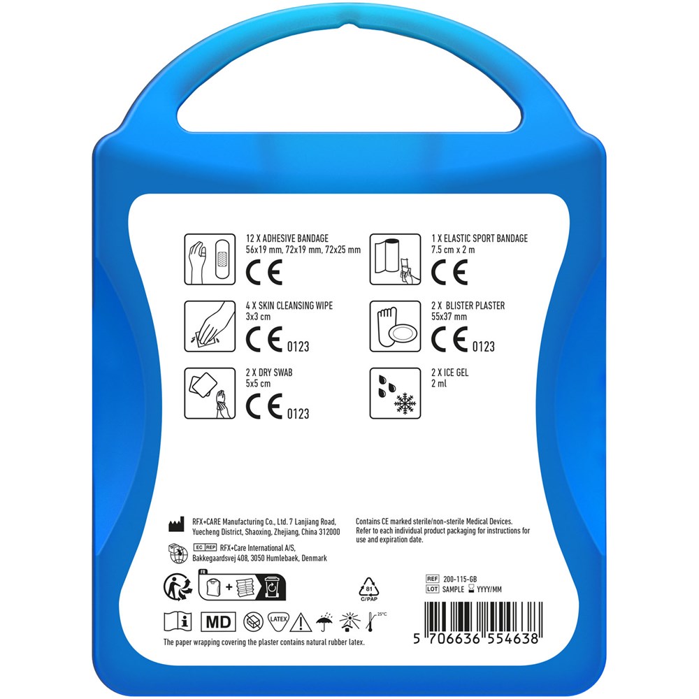 Ideales Erste-Hilfe Set für jeden Sportler. Dieses Set hilft Ihnen bei kleinen Verletzungen und Unfällen. Inhalt: 12 wasserfeste Pflaster, 4 hautreinigende Tupfer, 2 Trockentupfer, 2 Eisgel, 2 Blasenpflaster, 1 elastischer Sportverband. Alle im Set enthaltenen Erste-Hilfe- und Pflegeprodukte erfüllen alle geltenden EU-Vorschriften. Preis inkl. vollfarbigem Druck.
