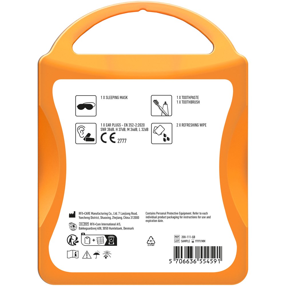 Ideales Reiseset für jede Reise. Mit diesem Set können Sie sich entspannen und erfrischen, sodass Sie ausgeruht an Ihrem Ankunftsort ankommen. Inhalt: 1 Augenmaske, 2 Ohrstöpsel, 2 Reinigungstücher. Alle im Set enthaltenen Erste-Hilfe- und Pflegeprodukte erfüllen alle geltenden EU-Vorschriften. Preis inkl. vollfarbigem Druck.